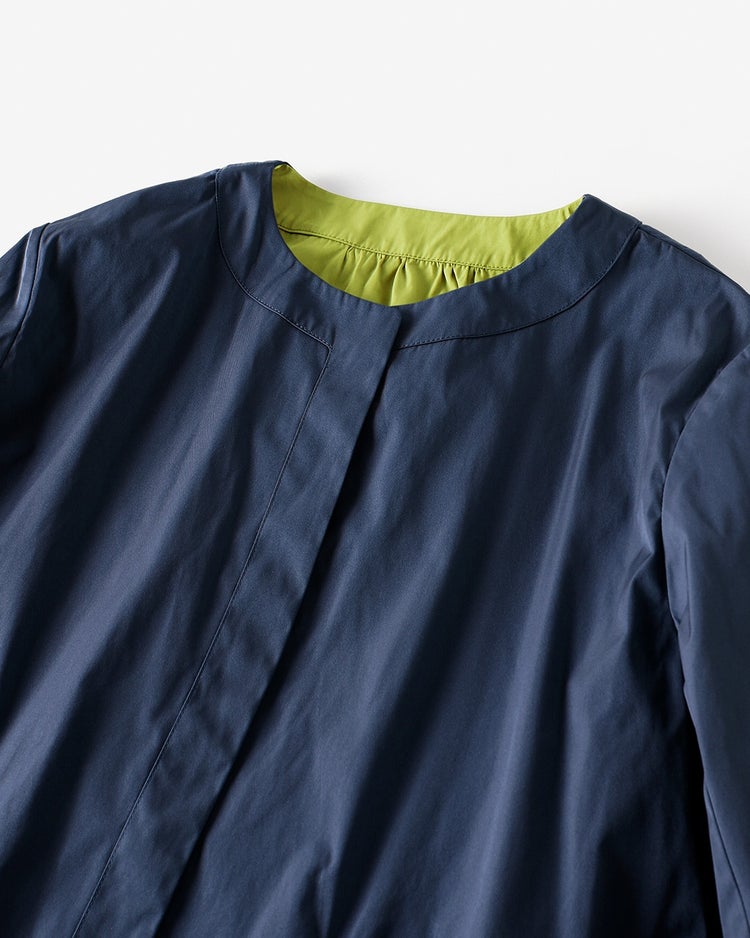 - だいたい何時もは11号ですが、試着してみたら何となく肩周りが突っ張る感じがして13号に交換してもらいました。前にホックやボタンが無く羽織るだけのデザインなので楽な感じです。内側にも外側と同じポケットが付いていて肩周りだけバイアステープが縫い付けてあるだけなので、リバーシブルでないのがもったいないなぁと思いました。シャキッとした張りのある薄手の生地なので、袖は内側に折ると七分や五分のように着れそうです。