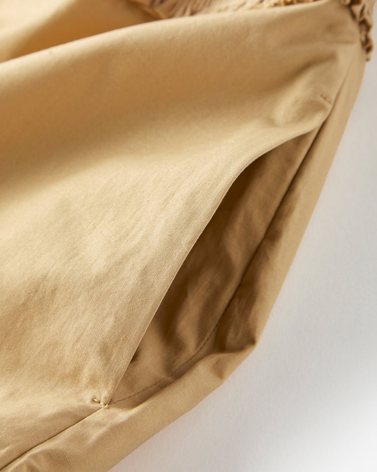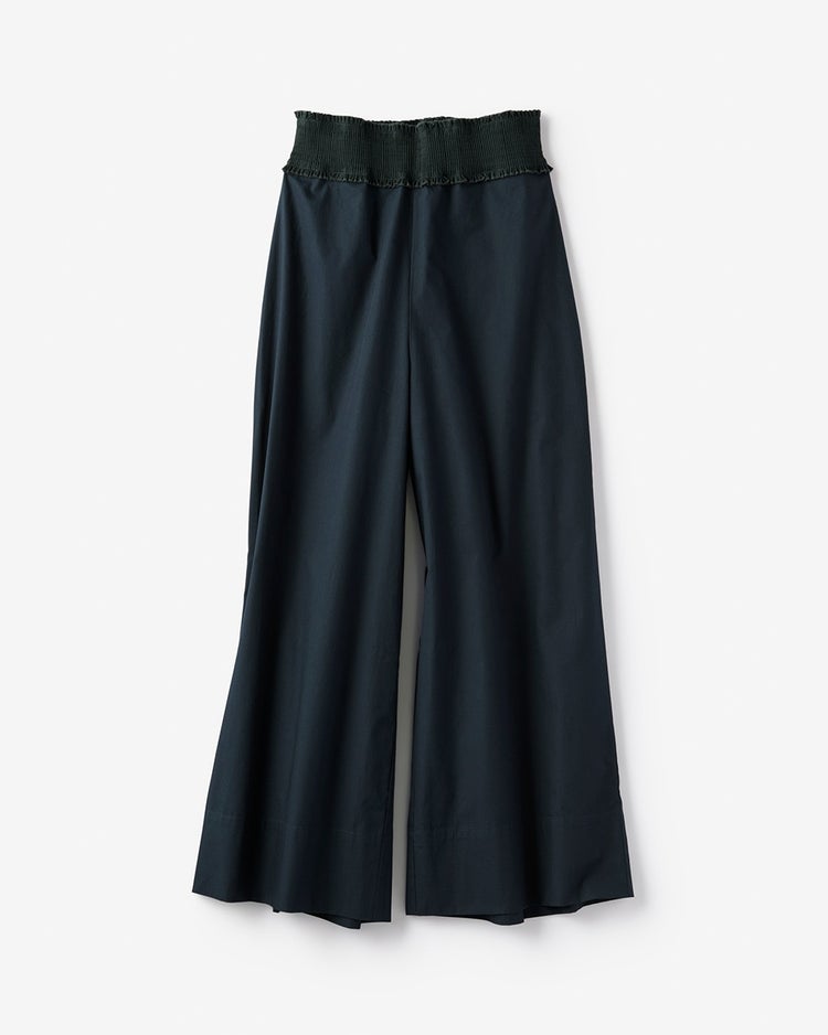 タイプライター生地で仕立てたワイドパンツは、軽く爽やかなはき心地。ウエストに施したシャーリング&フリルと、裾に効かせたステッチがデザインのポイントです。左脇にコンシールファスナーを備えています。