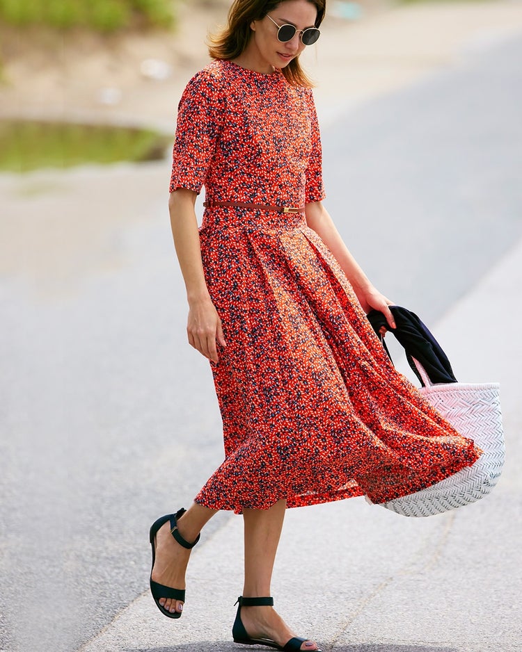 - オレンジを購入しました。ウエストを常に隠している、ぽっちゃり目の私です。このワンピースは、ウエストのゆとりもありながらベルトでマークできるので、着るとスマートに見えます。友達との食事に着ていったところ、色も柄も褒められて、嬉しかったです。セールになったら、色違いを購入したいです。 ※共布ベルトは少しツルツルして、緩んでしまいますが、合皮ベルトの方はしっかりウエストをマークすることができました。
