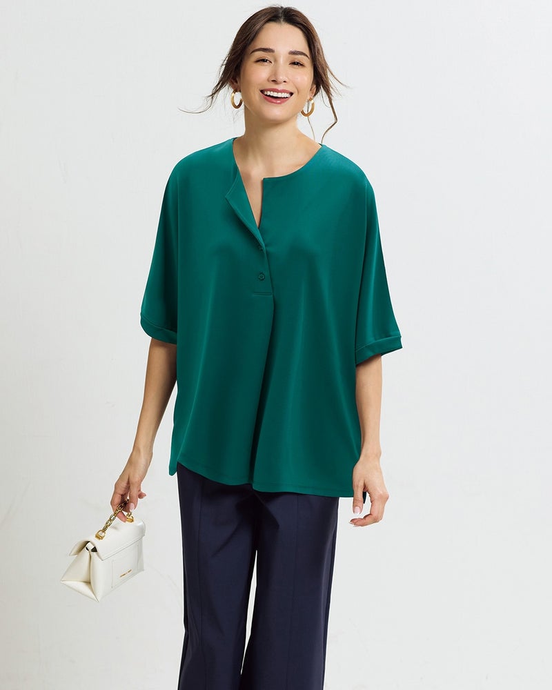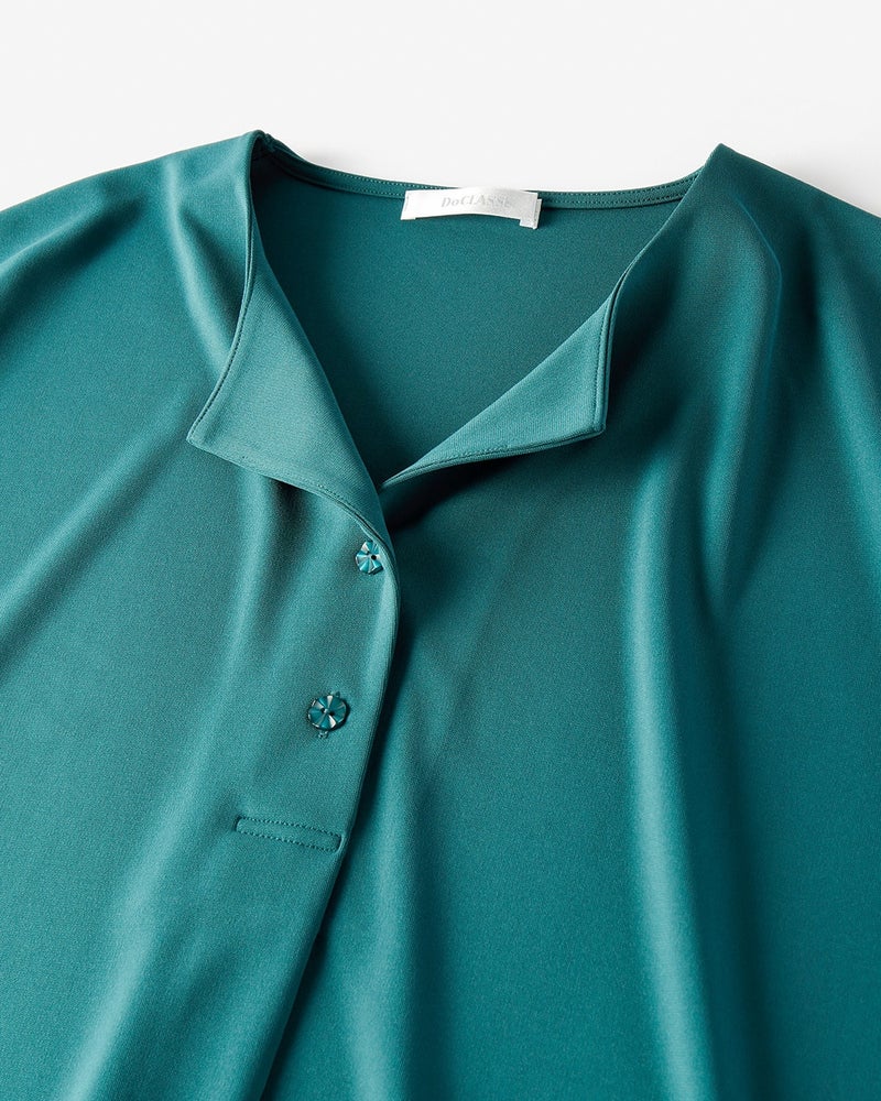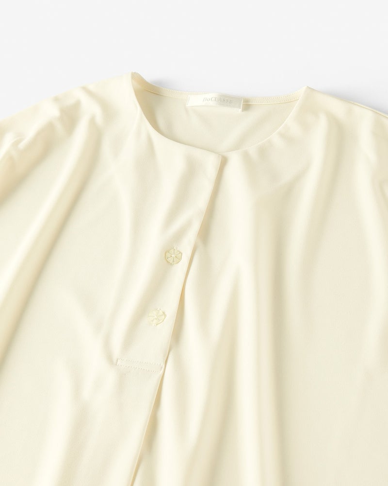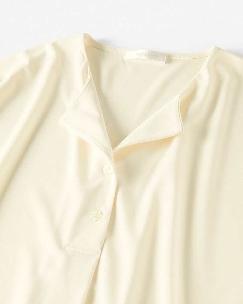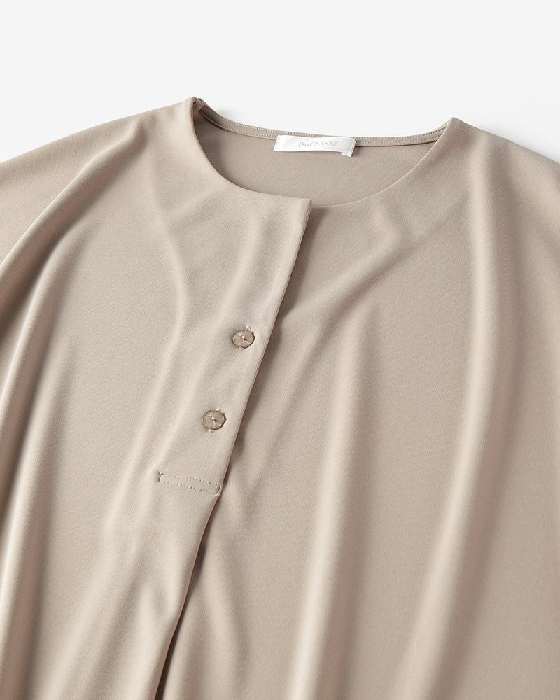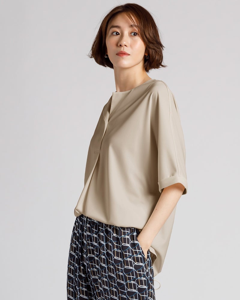 POINT1.身幅ゆったりの華奢見えトップス ほんのり鎖骨魅せデザインで上品な美しさを演出したブラウスは、タック使いでメリハリのあるデザインに仕立てました。 POINT2.ストレッチでストレスフリー エレガントなブラウス見え、でも着てみるとカットソー生地ならではの柔らかさとストレッチ性。自宅で洗えてお手入れが楽なのも嬉しいポイントです◎ POINT3.同素材のセットアップで、楽に着映えが叶う ワンピのように組み合わせを考えずに即コーディネートを完成できるのがセットアップのいいところ。同じ素材で自由に着まわしができる、ボトムスも揃えました。 同素材のスカートはこちら>>>> 同素材のパンツはこちら>>>>