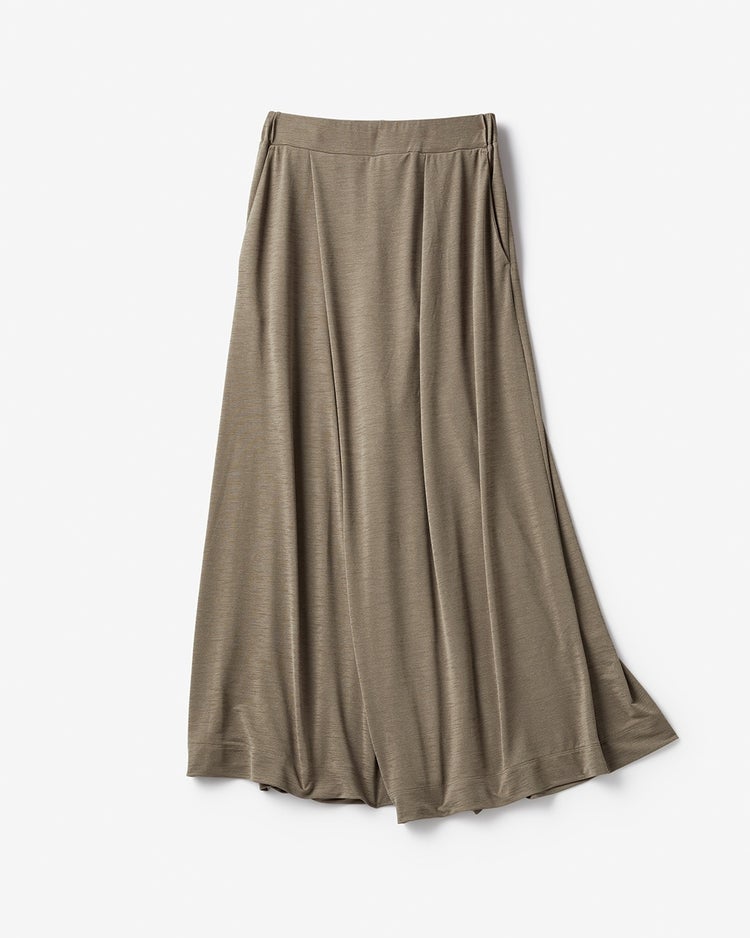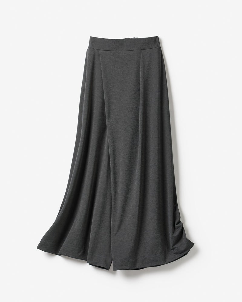 上品スカウチョ気になるウエストや脚のラインをカバー。ウエストは前側を平ゴム、タックを入れることで、トップスをインした着こなしもお洒落に決まります。