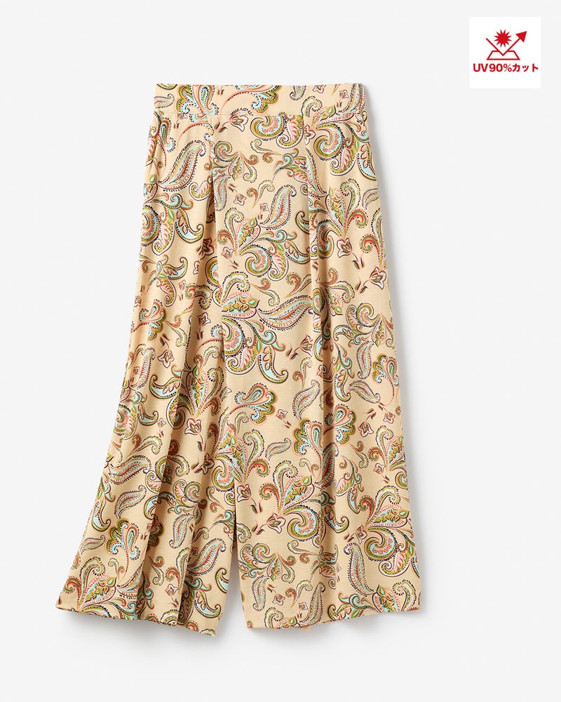 - ブラウンマルチ、Lサイズ購入、168センチ普通体型です。UVスラブシリーズは63センチ丈のストレートパンツが好みで何柄も持っていますがこの形は初めてです。スカートに見えるパンツで使い勝手が良いですね。柄は少し派手かなぁと思いましたがトップスに茶系、オレンジ系、ベージュや白も合うので色々楽しめそうです。
