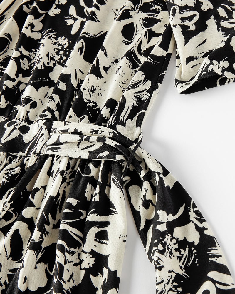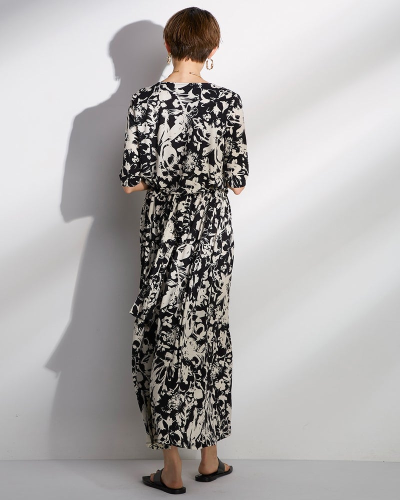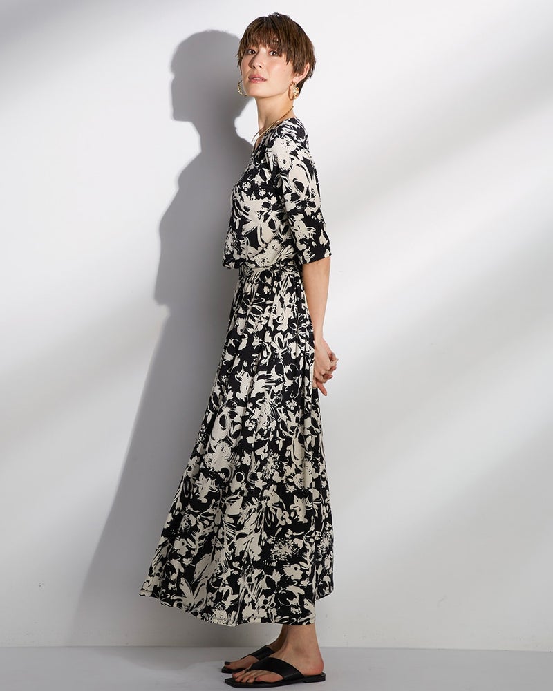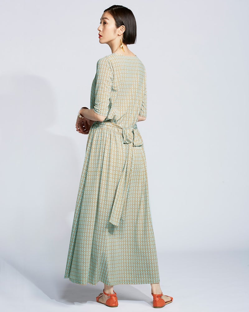 POINT② こだわりデザインすっきりしたVネックや共布リボンで引き締めるウエストシェイプのシルエットで細見せも。共布リボンは前後どちらで結んでコーデに変化を付けることができます。※ベルトの取り外しができない仕様になっています。