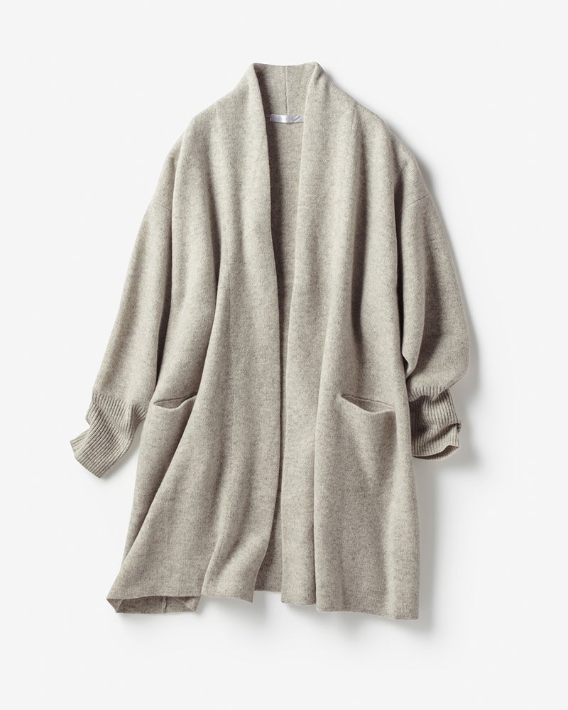 着た瞬間にふわっとした暖かさが感じられて、しかも持った感じよりも軽いです。少しゆったり目ですが、この時期のアウターとしても、真冬にはコートの中にも着られそう。また、部屋が寒い時にもサッと羽織って暖まれそうです。色違いが欲しくなりました。