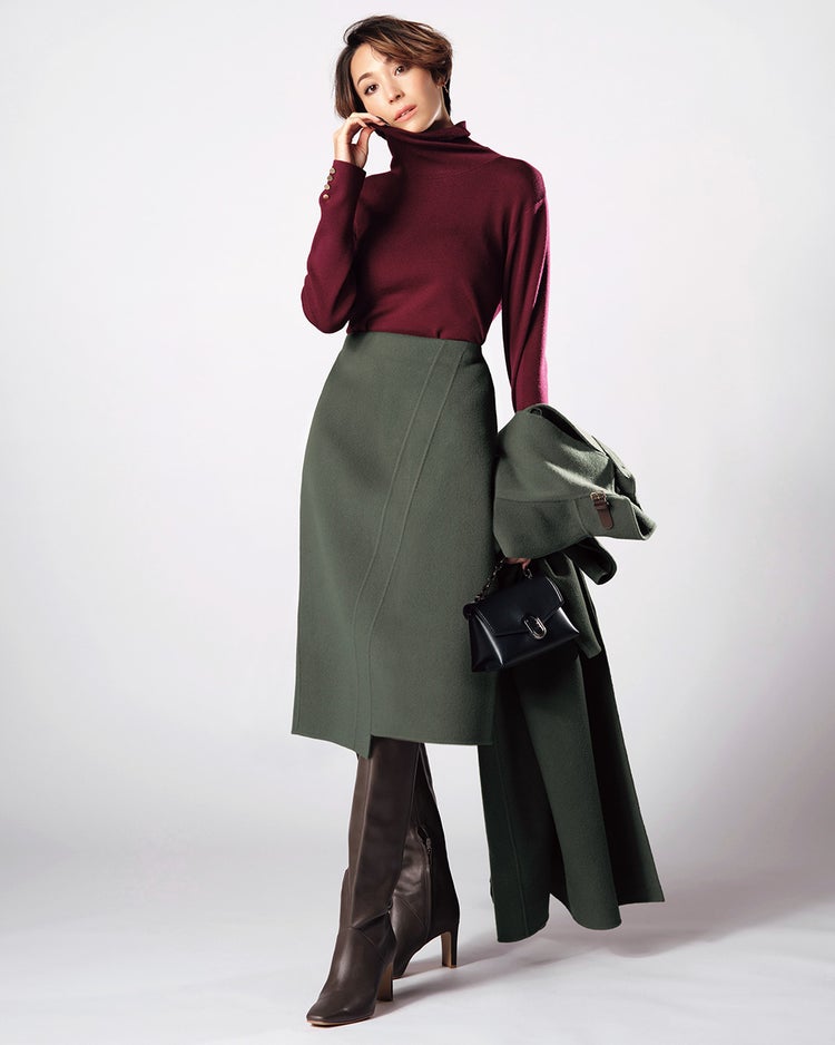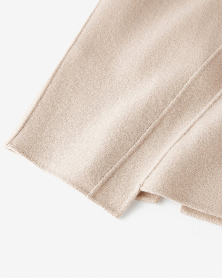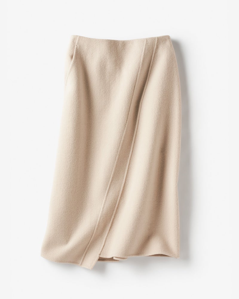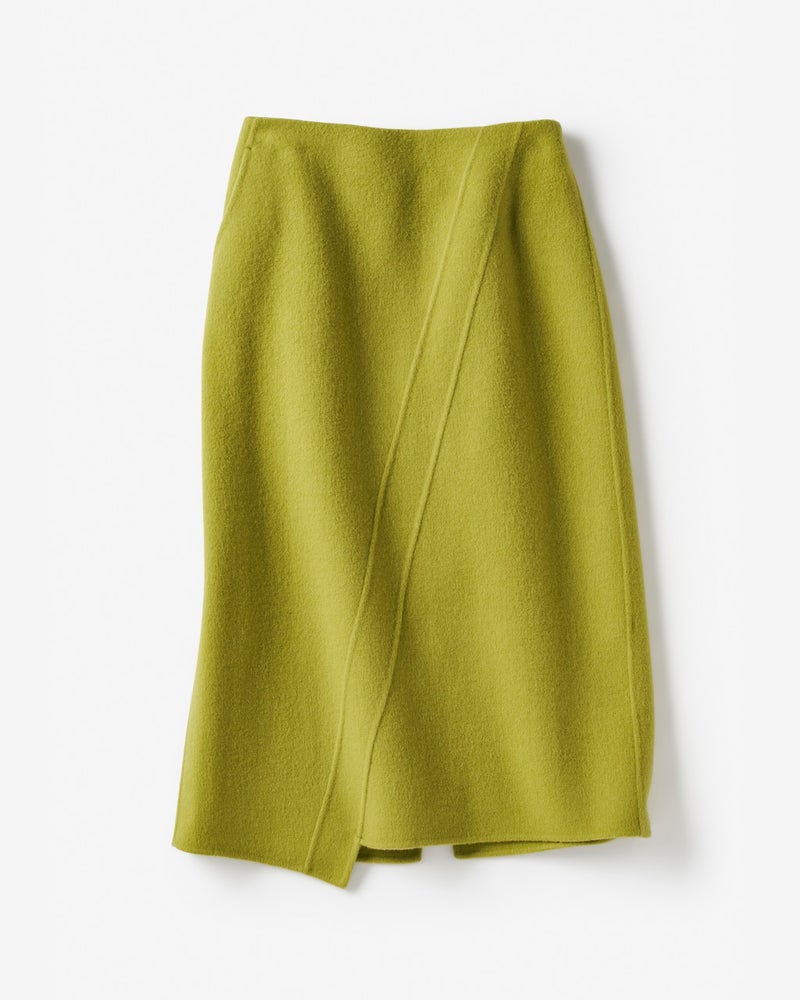 コートとスカートを同素材で着こなす、セットアップならぬ「コートアップ」の着こなしが叶うウールリバースカートが登場。素材は艶のあるカシミヤと生後6ヶ月の羊毛のみを使用した柔らかなジーロンラムをブレンドした極上ウールリバー生地。シンプルな膝下台形スタートに斜めの切り替えを入れたラップ風のデザインは下半身をすっきり魅せる効果も。ぜひコートと組み合わせて着て欲しい、新たなセットアップの提案です