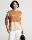 - ゆったり目に着たかったので、ワンザイズあげました。バイカラーで大人っぽいのにお色が可愛くて、顔周りが明るくなります。肌触りも良くてこれからの季節に活躍しそうです。プライスダウンで購入できて良かったです。