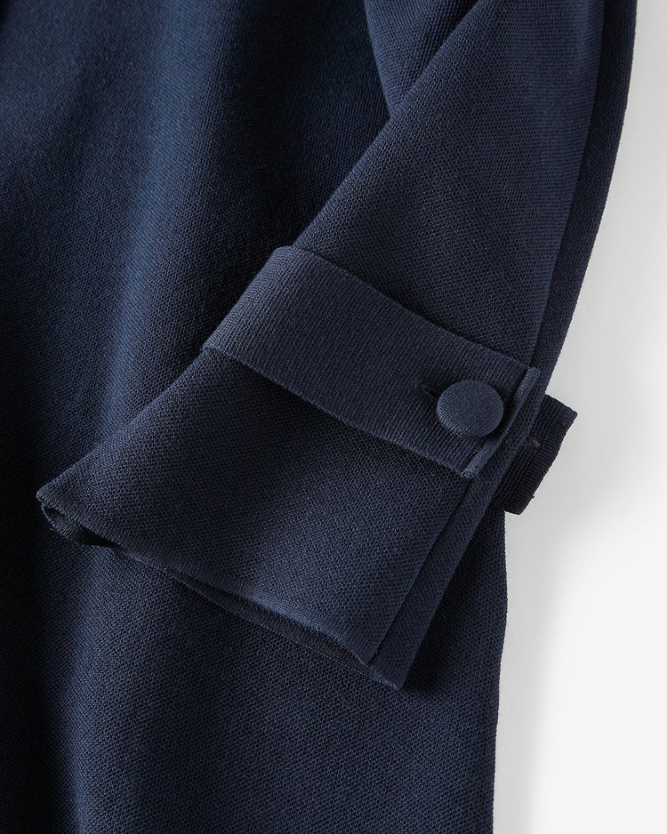 この度はせっかくお選びいただきましたのに、コート丈とメタルボタンがお客様のイメージと合わず残念な思いをさせてしまい申し訳ございません。ミラノリブのミドル丈コートは軽さと動きやすさも兼ね備え、パンツにもスカートにもあわせやすい着丈となっておりますが、人気のミラノリブを使ったデザインはジャケットタイプ(16455)やカーディガン(16369)もご用意がございます。ご検討いただけますと幸いです。