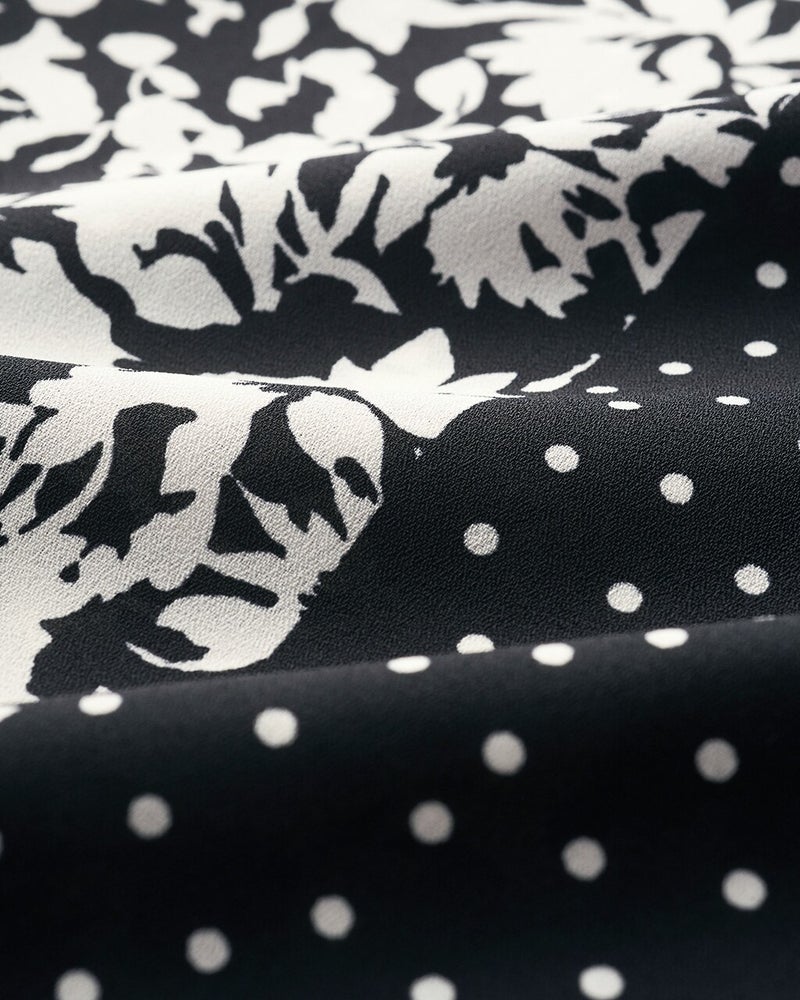 今シーズンのカジュアルは、どこかに女らしさのエッセンスを取り入れて。スニーカーにもパンプスにも似合う薄手のシフォンワイドパンツは、シックなドット×花柄のプリントで可愛らしい着こなしに。ウエスト総ゴムで気軽に着ていただけるデザインです。