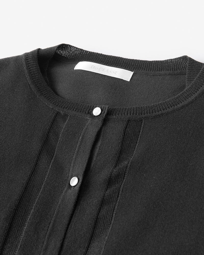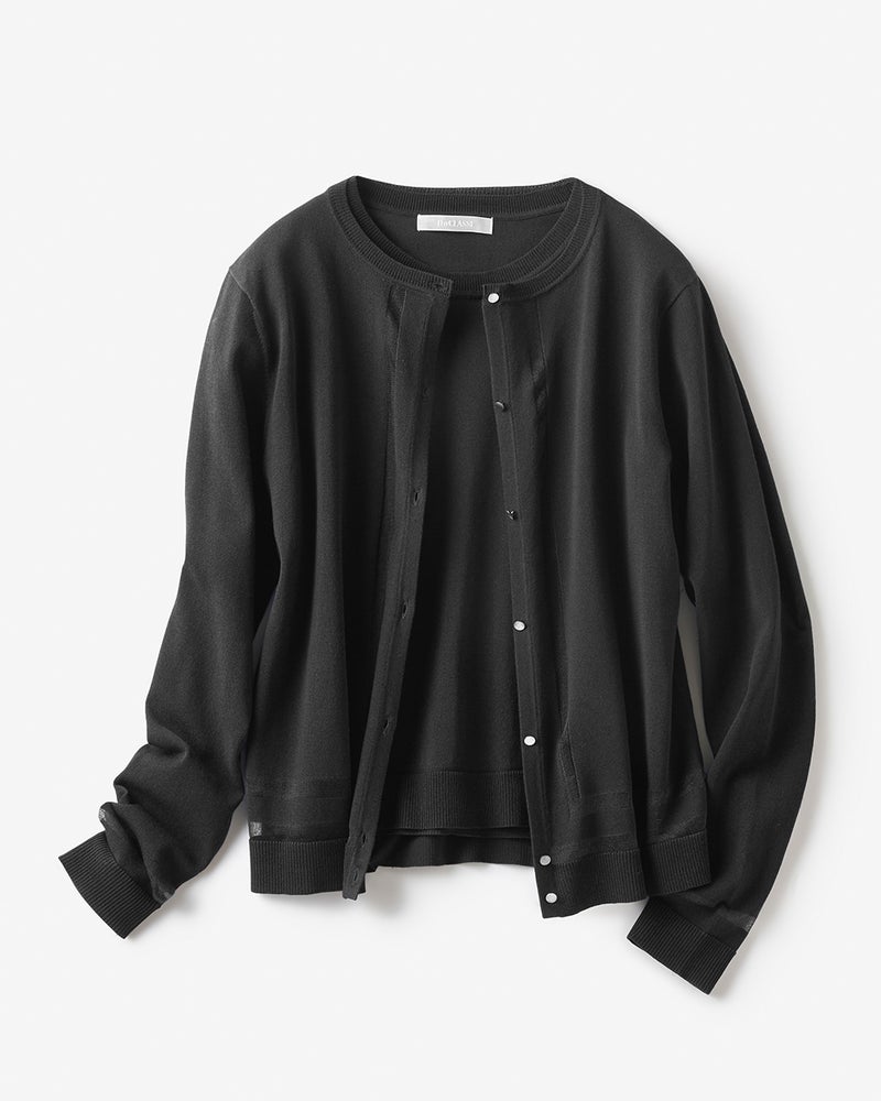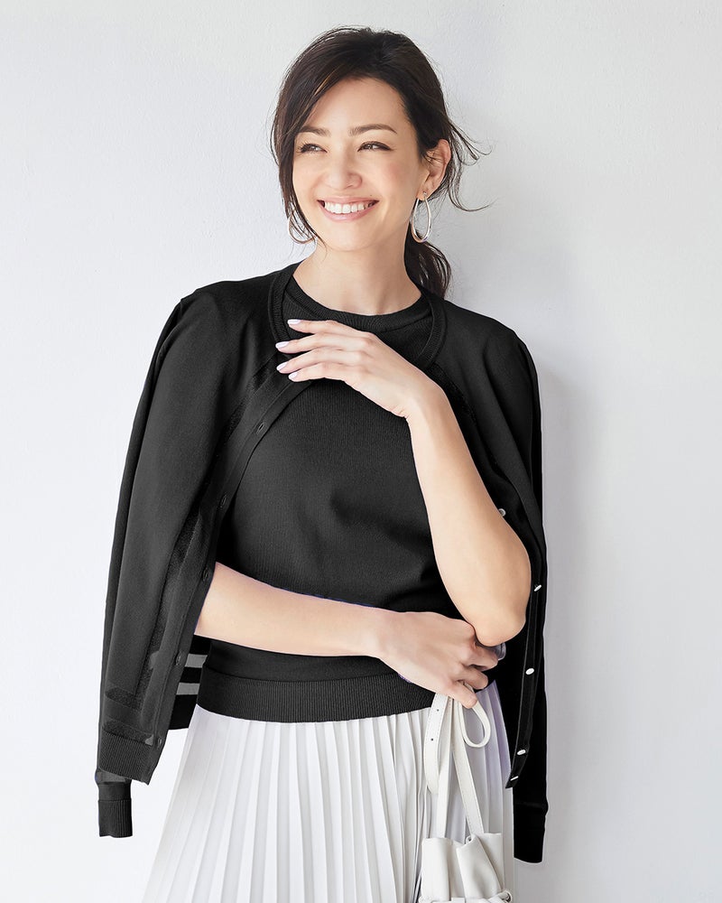 きれいめスタイルに欠かせないインナーニット+カーディガンのアンサンブル。透明糸を用いたシアーなライン使いで、単なるコンサバとは一線を画すレディな雰囲気に。インナーは袖口に透明糸のアクセントを入れたクルーネック、カーディガンは前立て、裾、袖口、背中心をシアーラインで彩った洗練のデザイン。