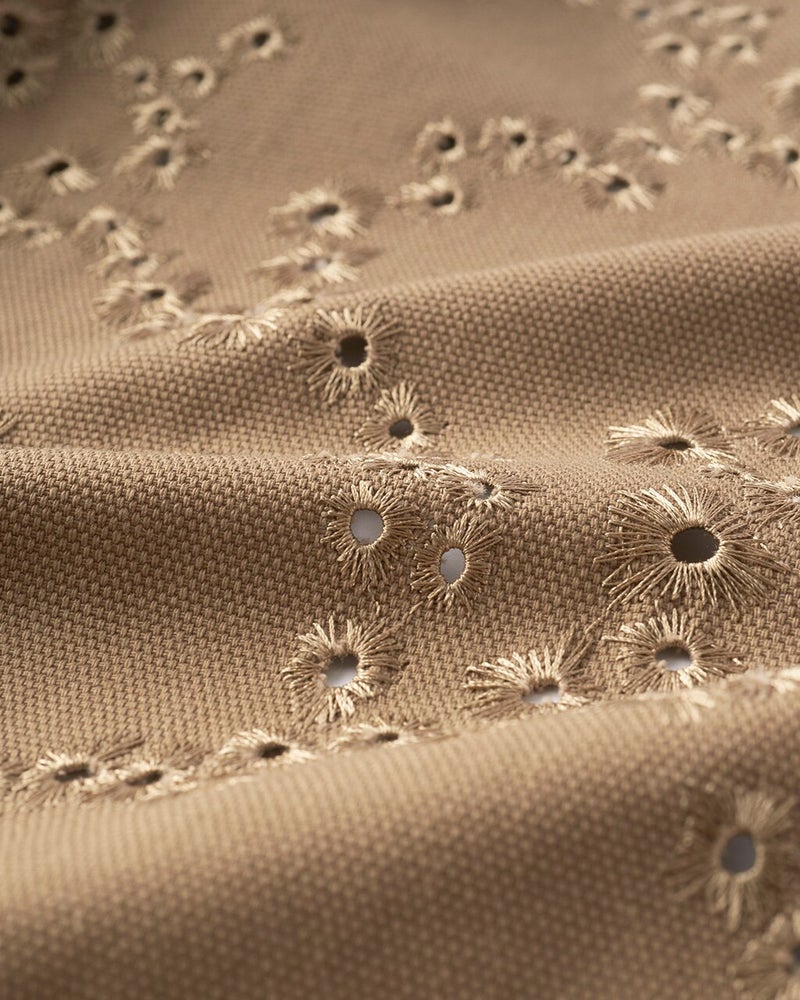 スタイリッシュな人は、自分の魅せ方を知っている人。パリッとしたコシのあるメンズライクなオックスフォード生地に、カットワーク刺繍を施し甘やかに。意外性のある取り合わせが魅力的なジャケットは、ショートな丈感で合わせるボトムを選びません。もちろん、カッティングにもこだわりが。わきの下にマチを設けることで、コンパクトなシルエットでも動きやすく仕上げています。