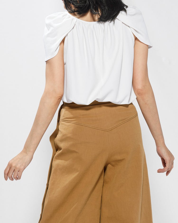 鎖骨を美しく魅せるジュエルネックのプルオーバーは、ネックラインを取り囲むように配したギャザーが美しいドレープを描きます。ふんわり肩を覆うパフスリーブが、かわいらしい雰囲気。長さのあるチュニック丈で、ブラウジングも美しくキマります。