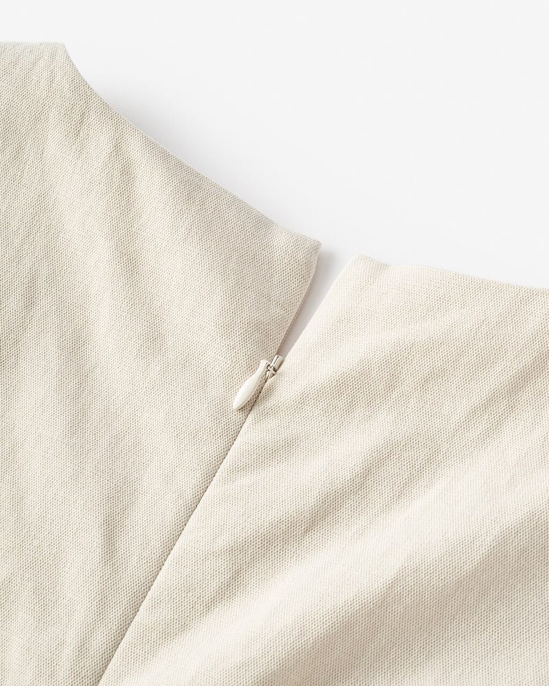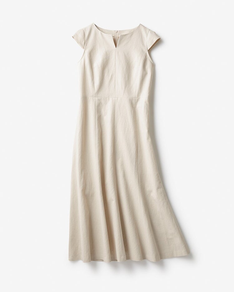 タテ糸にコットン100%、ヨコ糸にはリネンに伸縮性のあるポリエステルをミックス。ドビー織りにした生地をニドム加工(生地を叩く、揉み込むなどして柔らかく)することでふくらみを出し、ナチュラルな風合いに仕上げています。女性の曲線的なボディラインを美しく魅せる立体シルエットのワンピースは、マーメイド風ラインが柔らかなドレープを生み出しています。二の腕をさりげなくカバーするキャップスリーブ、タイト&フレアなシルエットがレディな雰囲気。キーネックが印象をきりっと引き締めて、さりげなく今を感じさせます。