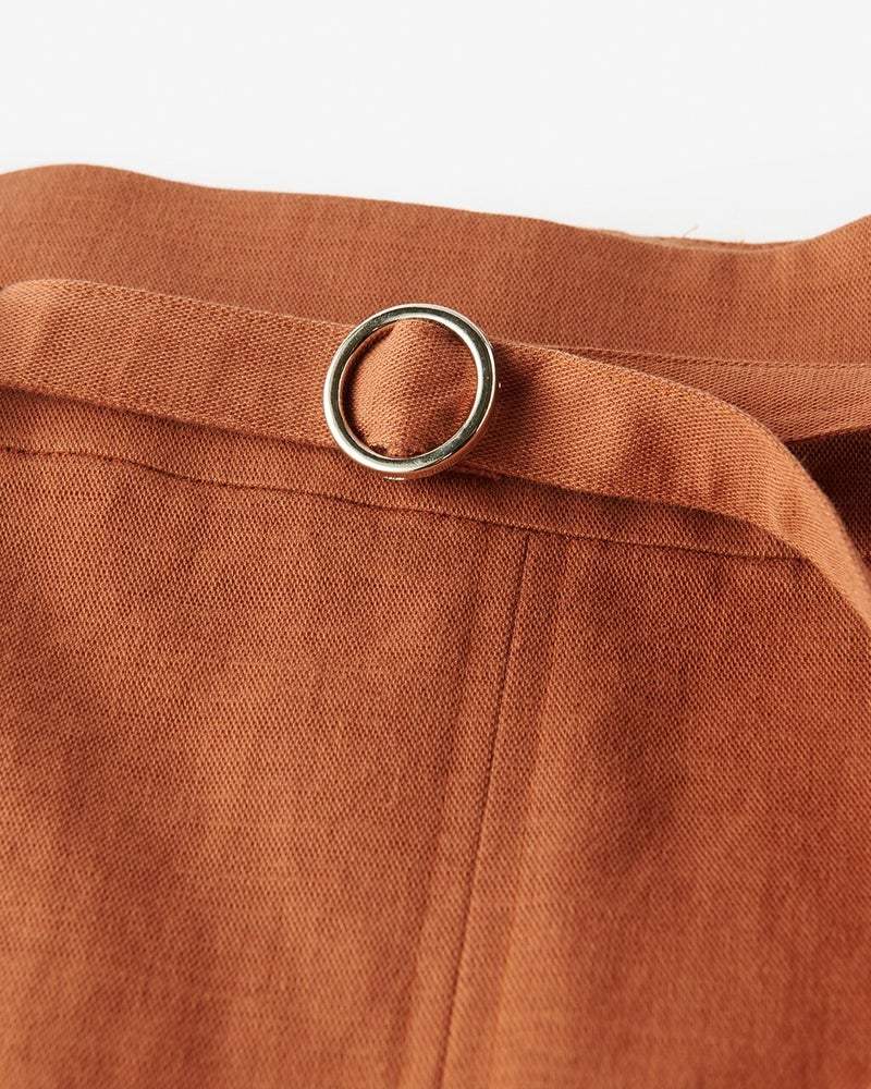 コットン糸と、リネン&ポリエステルの混紡糸を織り上げたドビー生地は、仕上げに揉み込むことでふっくら肌なじみ良い風合いに。すらり細身のシルエットでも、しなやかなストレッチ性と深めのスリットが、スムーズな足さばきを叶えています。正面から見た時のシックな印象と、カジュアルな抜け感のあるバックスタイルのコントラストが楽しい1着。