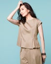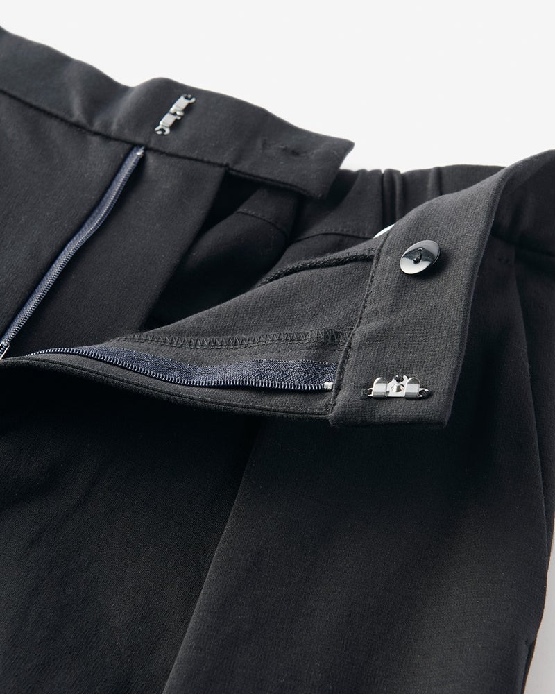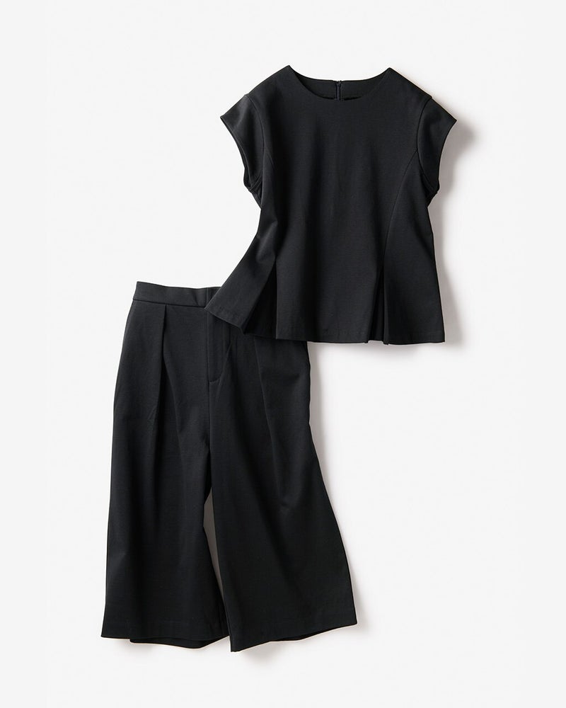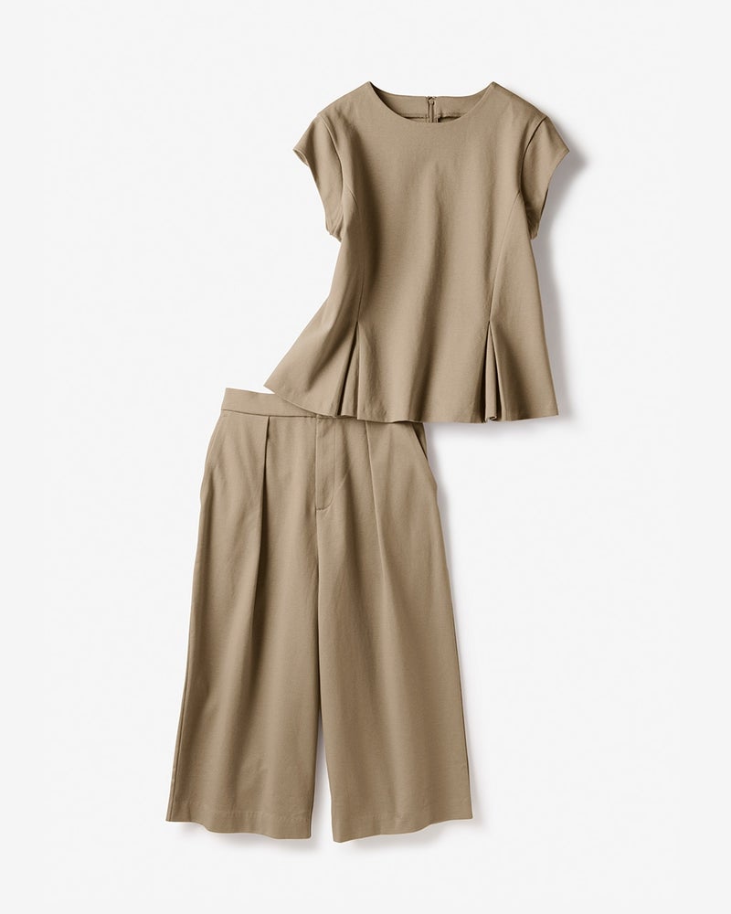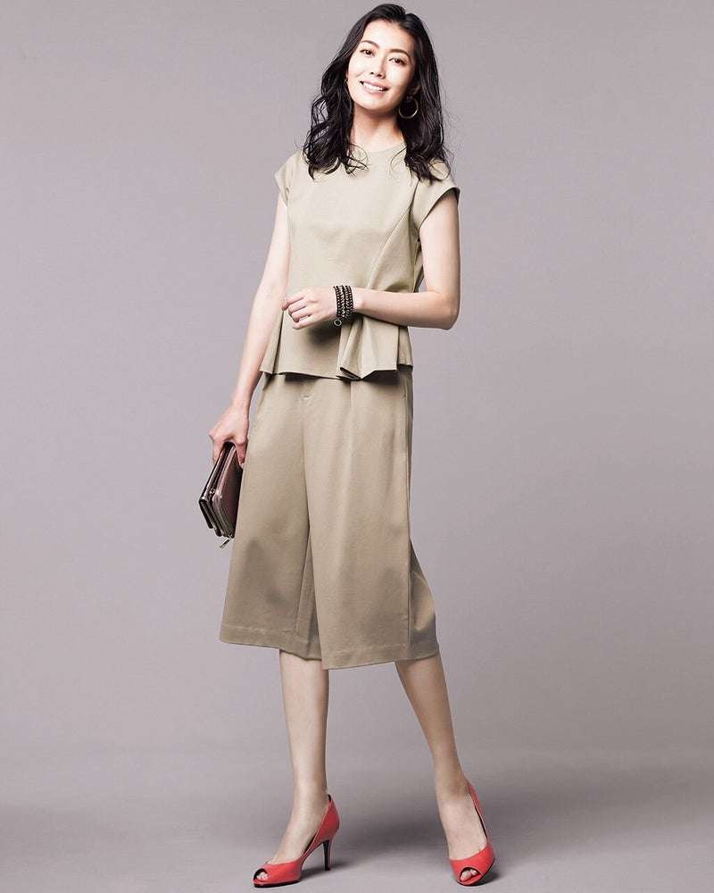 この夏大注目のハーフパンツコーデ。大人の女性らしく着こなすなら、膝を隠す長め丈とワイドパンツ風のシルエットでモダンな雰囲気に。トップスは肩をすっきりカバーするフレンチ袖、ウエスト下にタックを入れて美しいAラインに仕上げました。素材は着心地良く体型も拾わないストレッチポンチ。通勤にもお出かけにも似合う、大人のためのセットアップです。