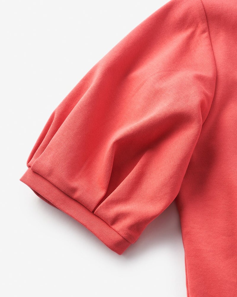 - コーラル、綺麗な色です。生地がしっかりしているので汗をかいても気になりません。二の腕が太いのでパフ袖が少しきついですが、高見えするTシャツで気に入っています。