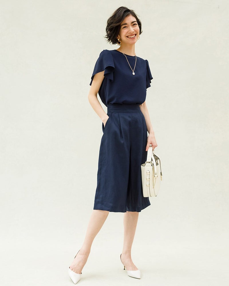 ワイドパンツは短め丈が今シーズンのトレンド。しっかりハリ感のある14番リネンなら、ボディラインを拾わずにハーフワイドパンツの着こなしが叶います。やや裾広がりに仕立てて、スカート派の方にもおすすめできるフェミニンなシルエットに仕上げました。