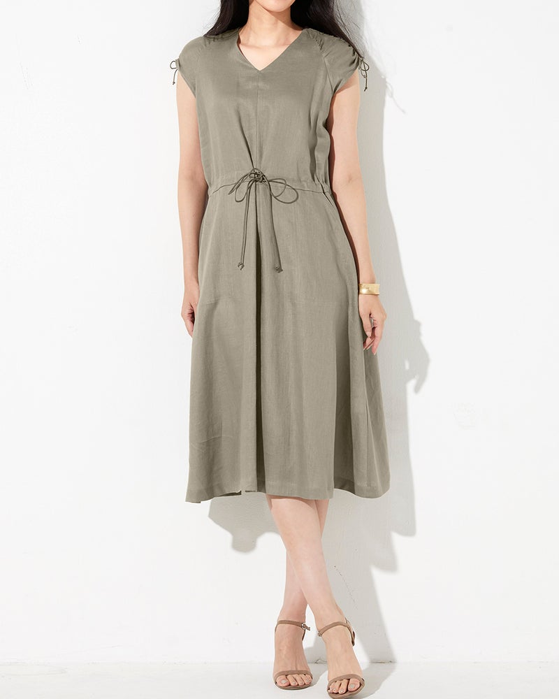 空気を含ませながら麻糸を甘く織り上げたリネン素材。肌に柔らかく、袖を通した瞬間からふんわりと馴染む質感が魅力です。肩、ウエストにドローコードを通したワンピースは、調節次第でシルエットが変えられる優秀デザイン。