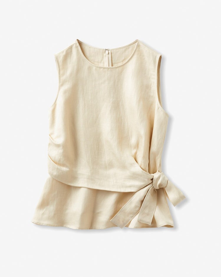 シルクのような艶、なめらかなドレープをまとったリネン混素材のブラウス。ジャケットやカーディガンを羽織った時にもノースリーブだからもたつかず、ロングシーズンお召しいただけます。ウエストマークできるリボンと、ややフレアな裾のラインが重心をより高く、女性らしいメリハリを演出。別売りのワイドパンツ(17707)とセットアップで合わせれば、パーティのような華やかなシーンにもぴったり。