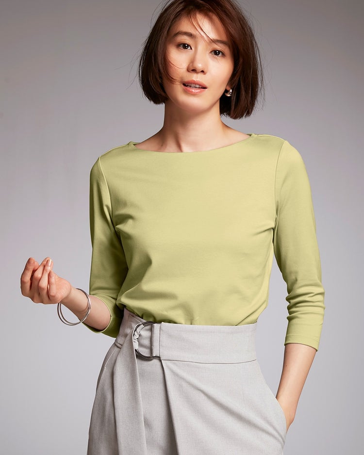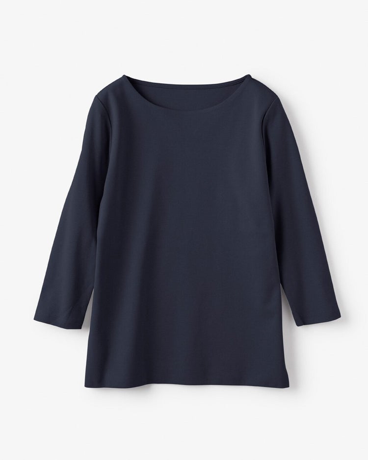 - ボートネックと言っても横が空きすぎて下着が出る感じはないです。ジャケットやカーディガンの中に着ると襟あきがきれいで、首のしわもいい感じに隠れる気がします。前見頃が二重になっているので、気になる下着のラインも透けないので、白でも安心でした。七分袖と五分袖と両方揃えてしまいました。