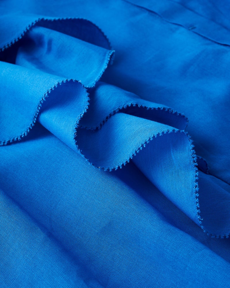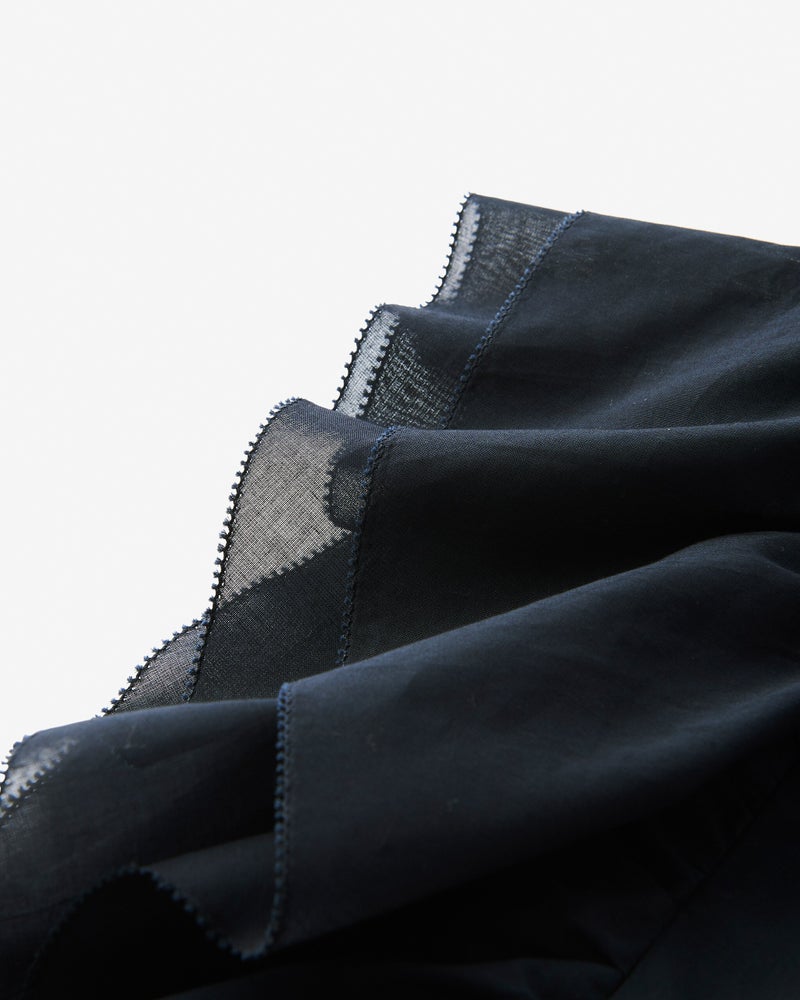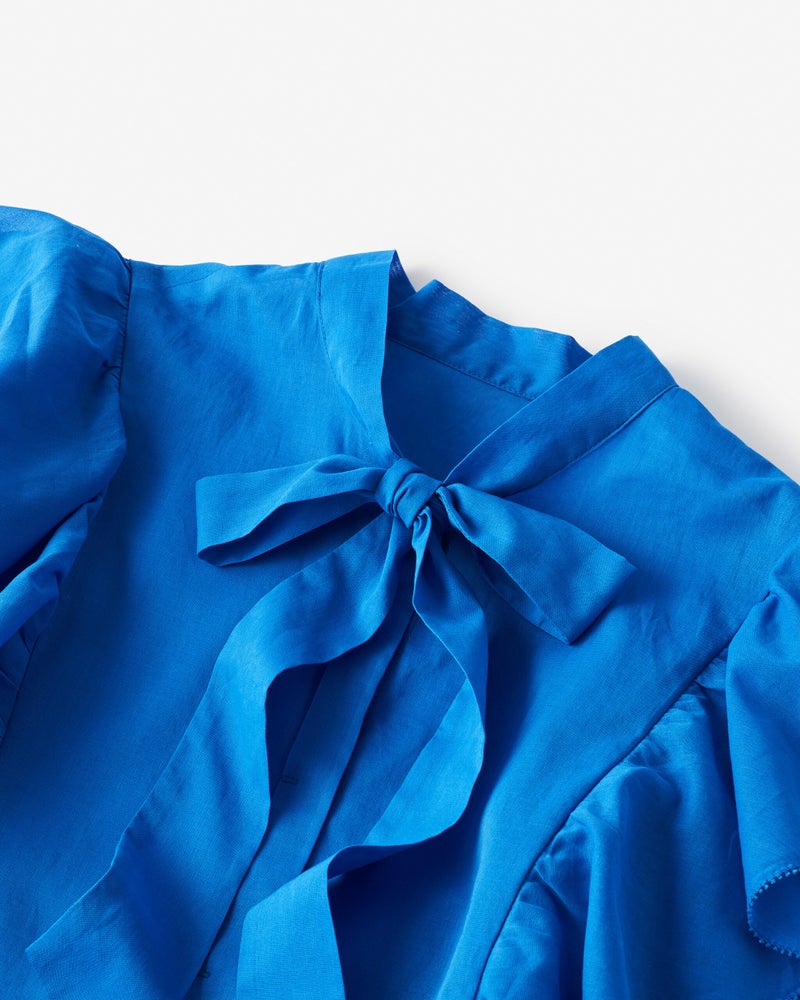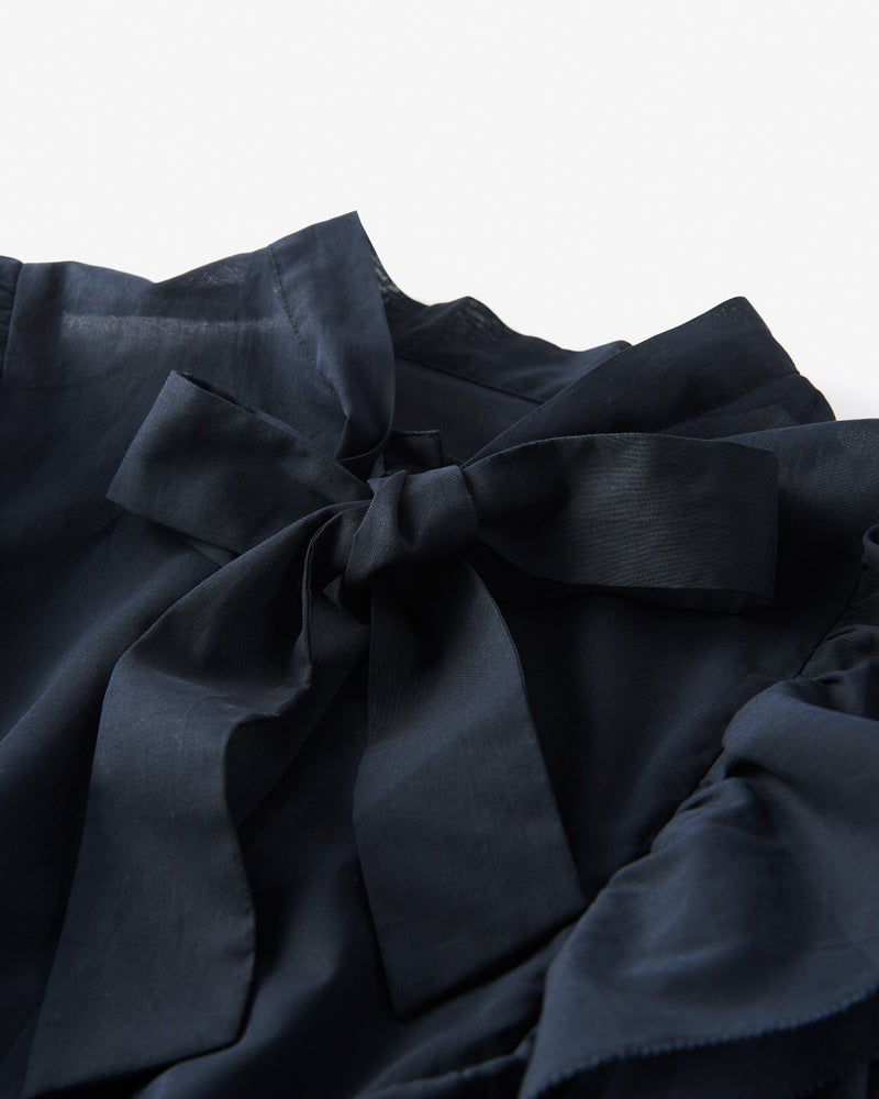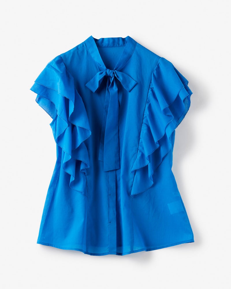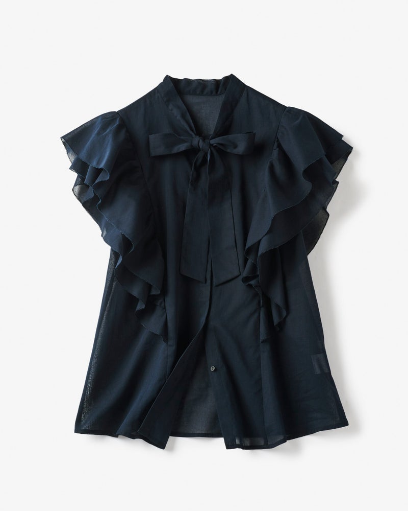 袖のたっぷりフリルで華やかに盛り上げつつも、細めのボウタイが全体をシャープに引き締めます。二の腕を部分的に隠す大人に嬉しいデザインや、生地端をピコレースにした凝った作りもポイント。