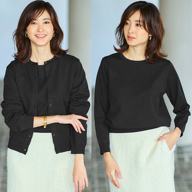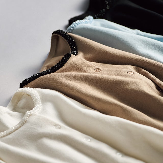 ウールを使わず、肌触りなめらかに編み立てたハイゲージのアンサンブルニットは、カーディガンのネックラインにあしらったカットビーズがチャームポイント。顔まわりに光を集めながら、肌を明るく見せてくれます。