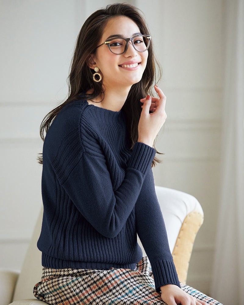 スタイルを選ばないシンプルな畦編みニットは秋冬コーデの必需品。表身頃は片畦、袖とバックスタイルは天竺と、編み地に変化をもたせてニュアンスを表現。カシミヤの使用でちくちく感を抑え、快適な着心地を実現しています。後ろ身頃は、すっきりとした編みで、バックスタイルも美しく見せてくれます。