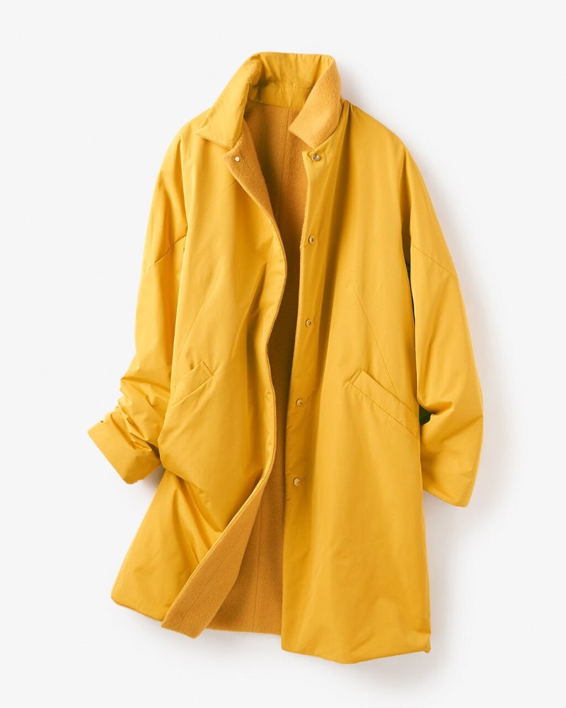 雨の日OK!な撥水タフタと、上質感の漂うカシミヤ混の軽量ウールのリバーシブル。裏面はポリエステルのタフタ生地に撥水加工をプラス。雨や雪の日も安心です。微光沢でハリがあるので、カジュアルすぎない大人の装いにピッタリ。