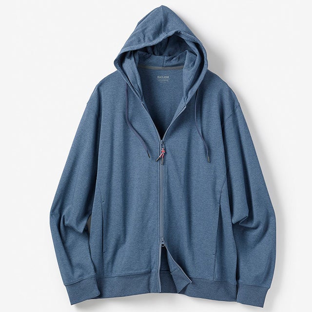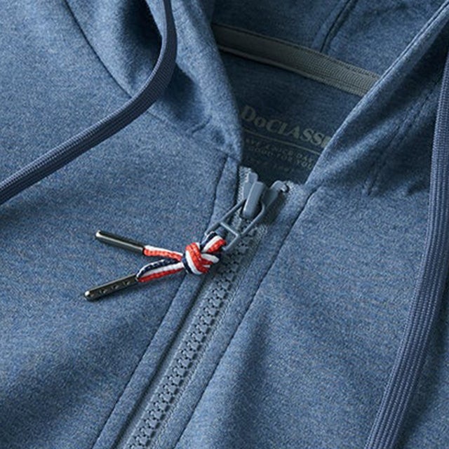 フロントファスナーのトリコロールの引き手が、さりげないアクセントに。