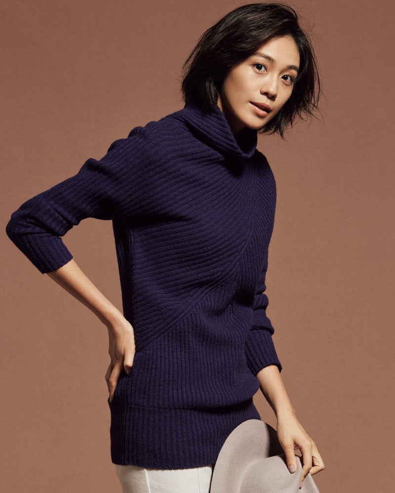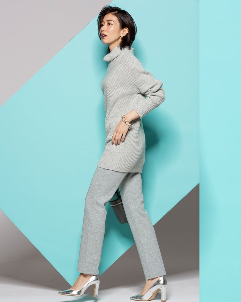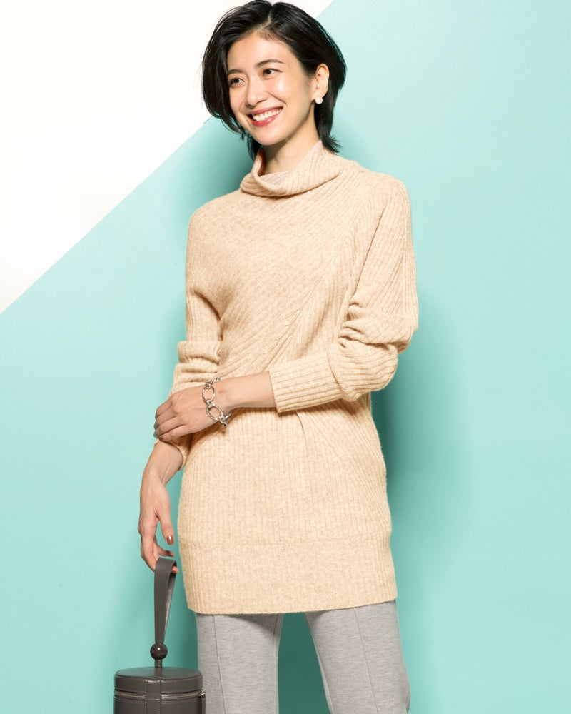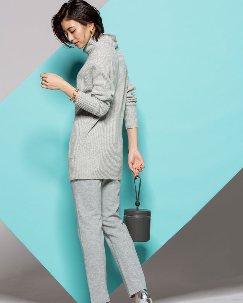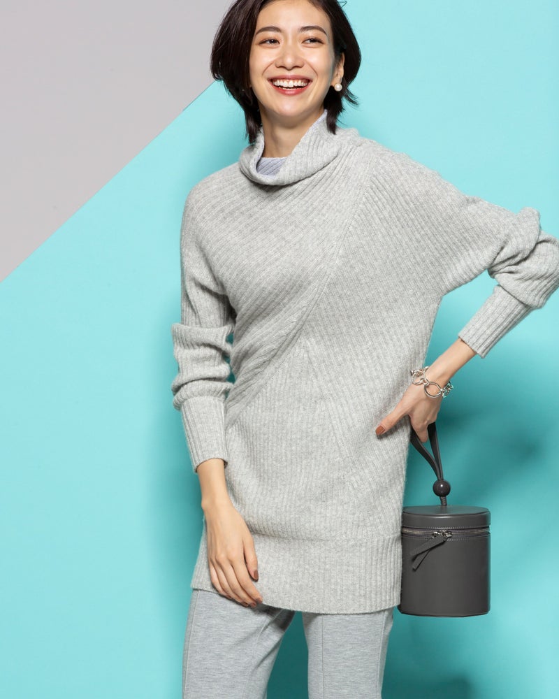 「スリムに見える!」と毎年大人気のアシメリブ。今季は切り替え位置を見直し、いっそうほっそり見えるデザインに進化しました。背面はあえてシンプルな縦リブに。素材は贅沢なカシミヤ混にバージョンアップ。首元はチクチクが気にならないよう内側をコットン糸にしています。