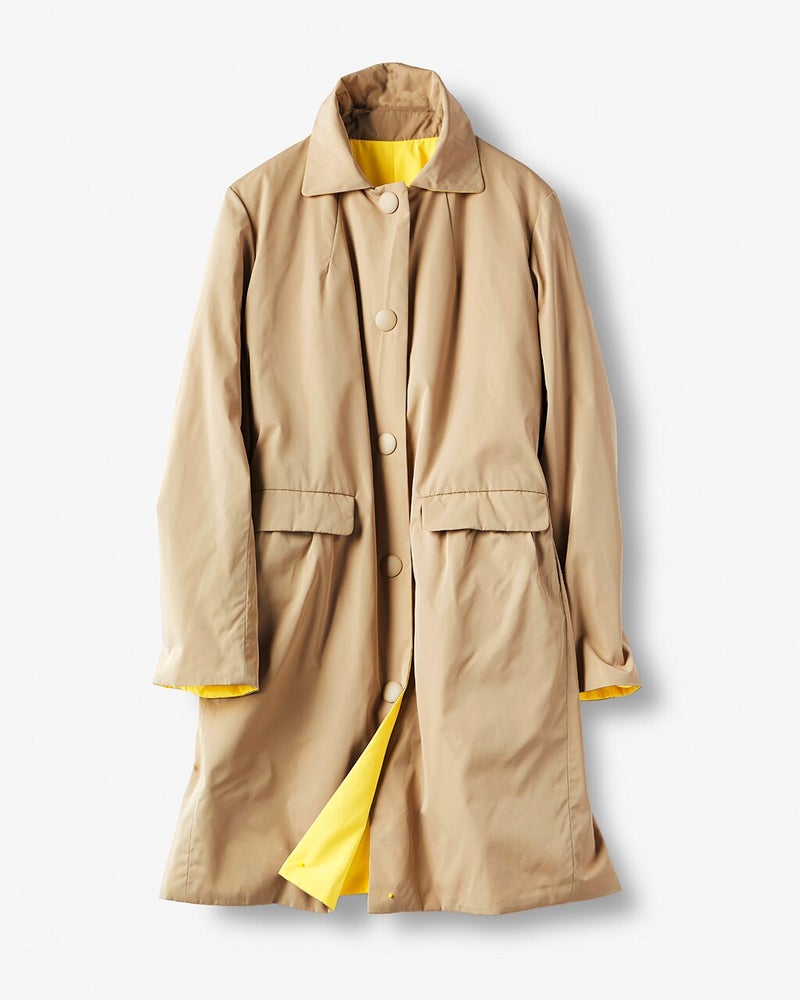 - ベージュの面がペラペラと音を立ててビニール製品のようでした。周囲の評価も同じ。 ブラックとのリバーシブルが楽しめそうかと思いましたが、実物を見ると安っぽい印象。 襟に折れシワが深くついていたのと、縫製の不具合もあり、違う商品に返品交換しました。 シワはスチームかけても取れませんでした。