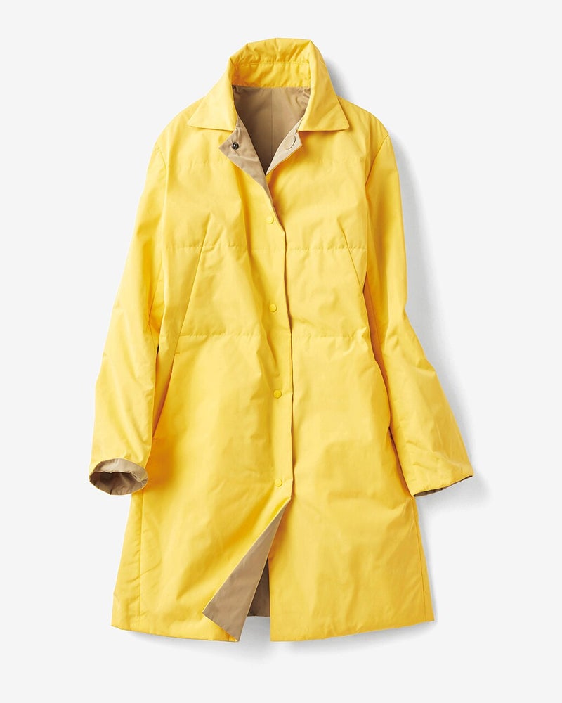 薄さ、軽さに加えて、シルエットの美しさもポイント。大人のボディをキレイに見せるシンプルなデザイン、立体的なカッティング。表面はギャザーを入れて甘めに、裏面はシンプルに。お洒落が楽しめるリバーシブル仕立てです。
