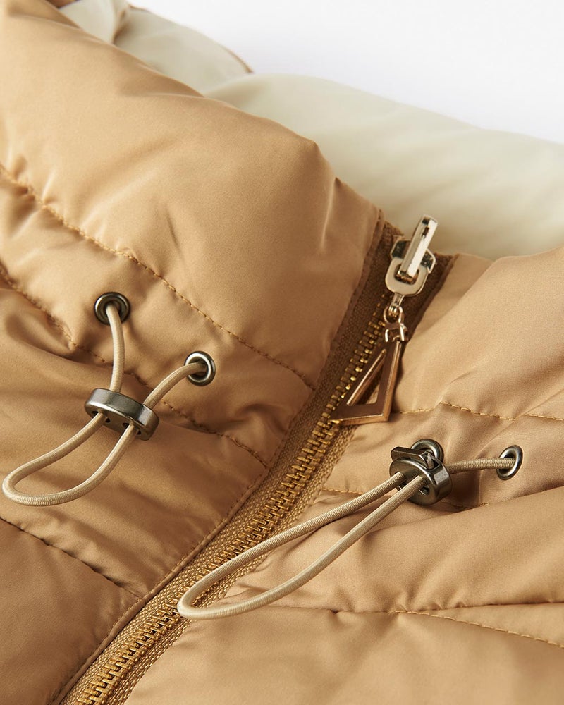 衿はボリューム感を抑えたスタンドカラー。ドローコードを軽く絞ると、すっと綺麗に立ち上がります。縦のラインを強調するので背を高く見せる効果も。