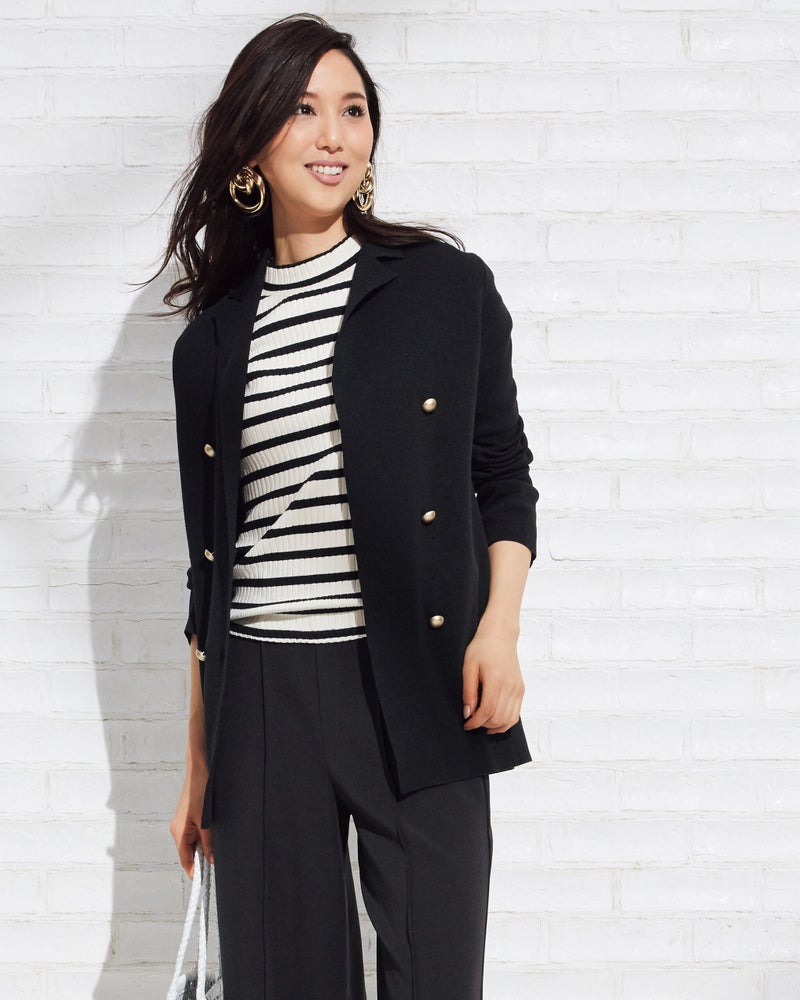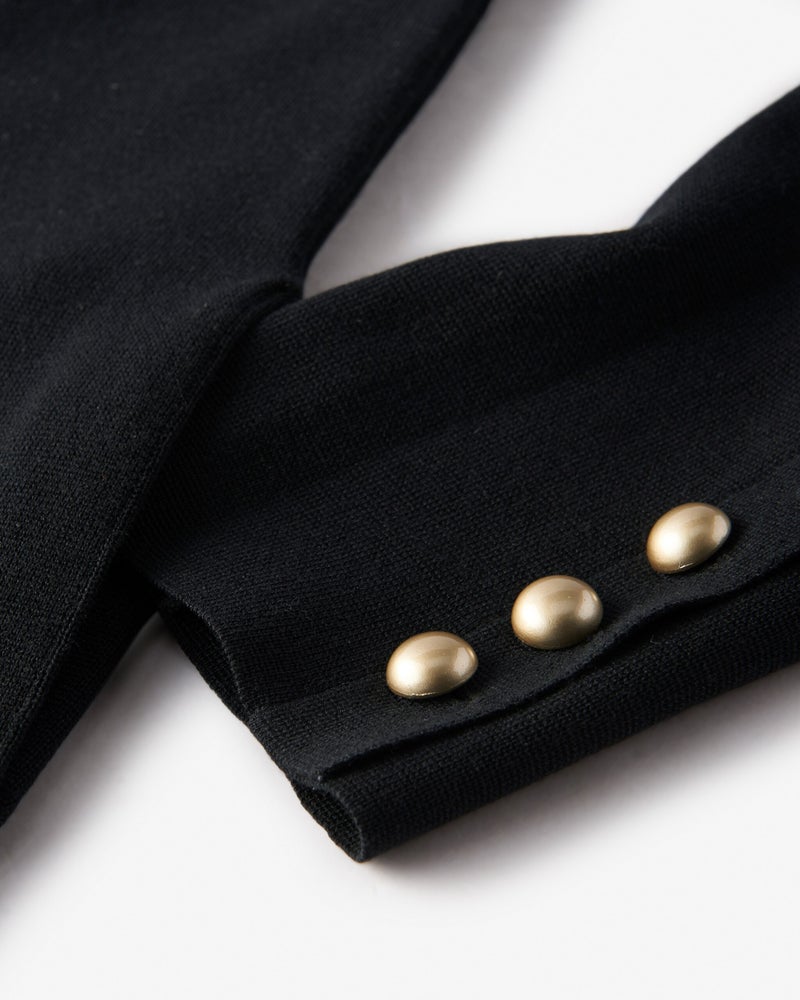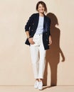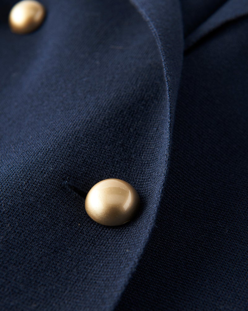 パンツにもベストマッチ定番の「普通丈」。金ボタン、スラッシュポケットできちんと感のある仕立て。女らしく着こなせる9分袖。袖口ボタン付き。