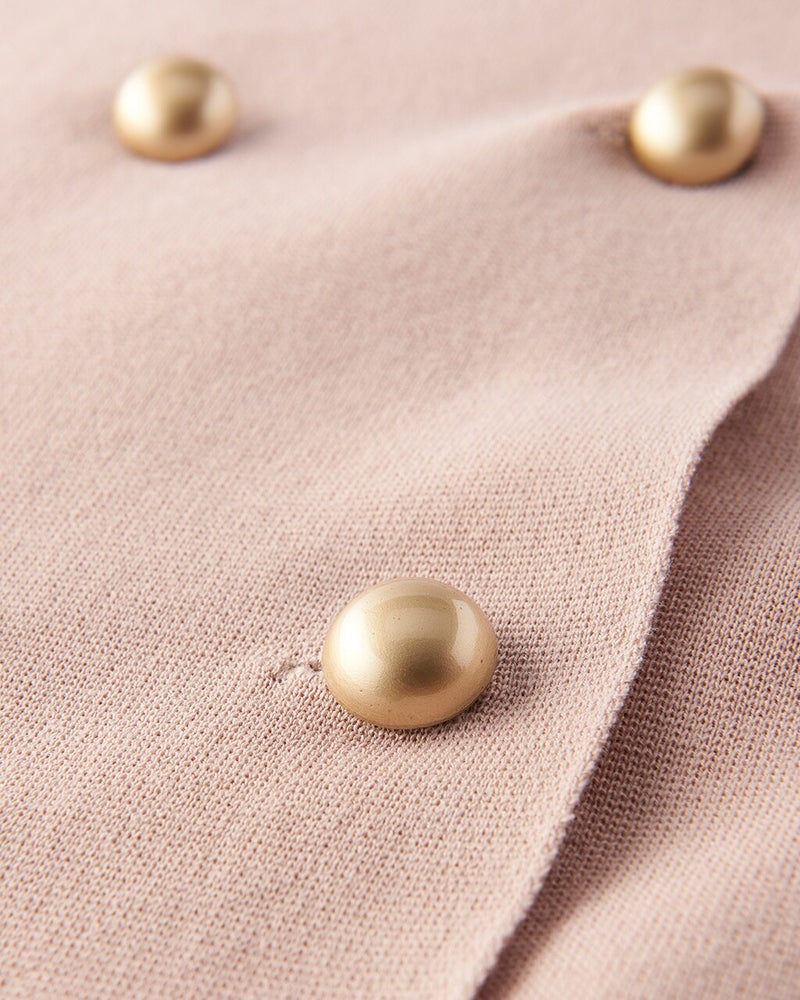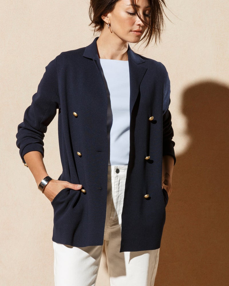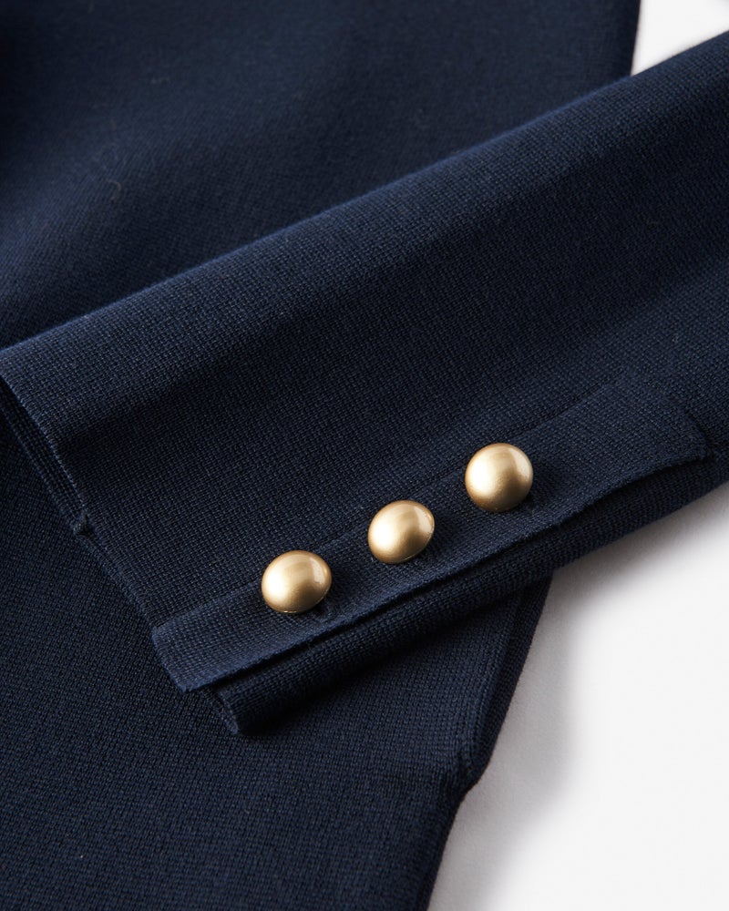 - 着やすく、シンプルで気に入ってはいます。ただ前のゴールドのボタンが昔っぽく、縫ってあるのを取ってボタン無しで着ています。シンプルに紺のボタンで良いのではと思います。自分で新しいボタンをつけようと思いましたが、特にボタンが無くても大丈夫でした。