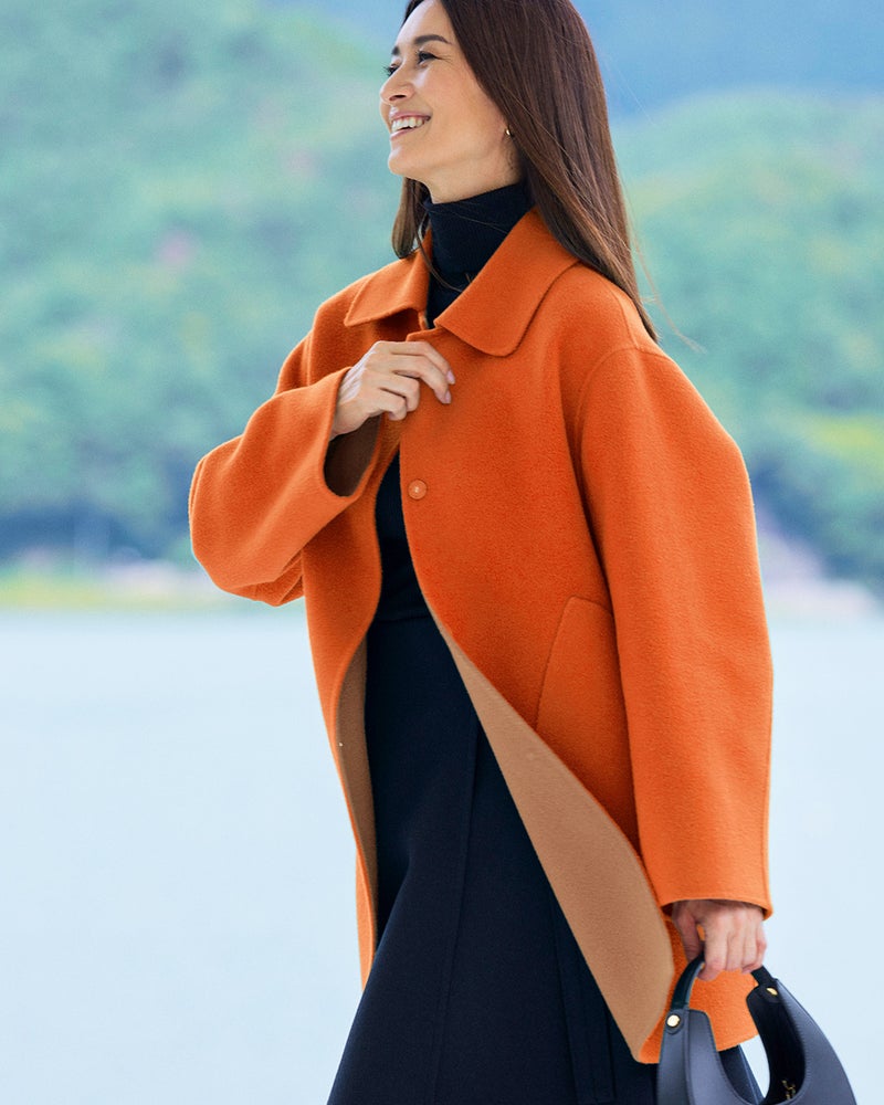 最高級ジーロンラムにカシミヤを贅沢にブレンドふわりとカラダを包む軽い着心地、柔らかで女性らしい表情が魅力のウールリバーコート。