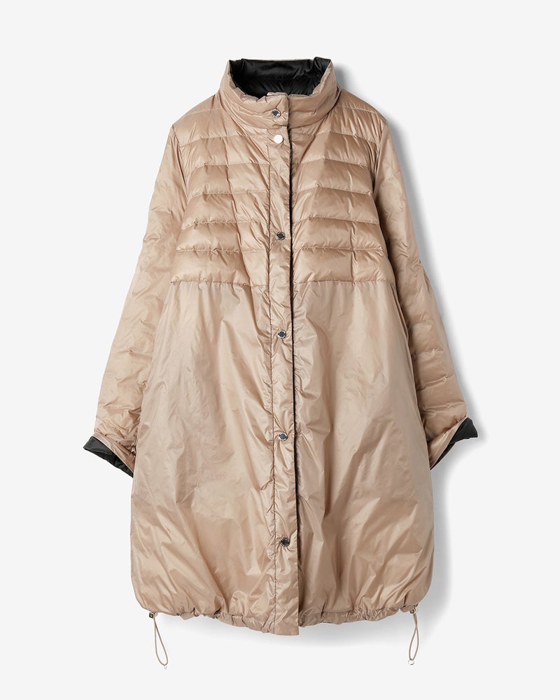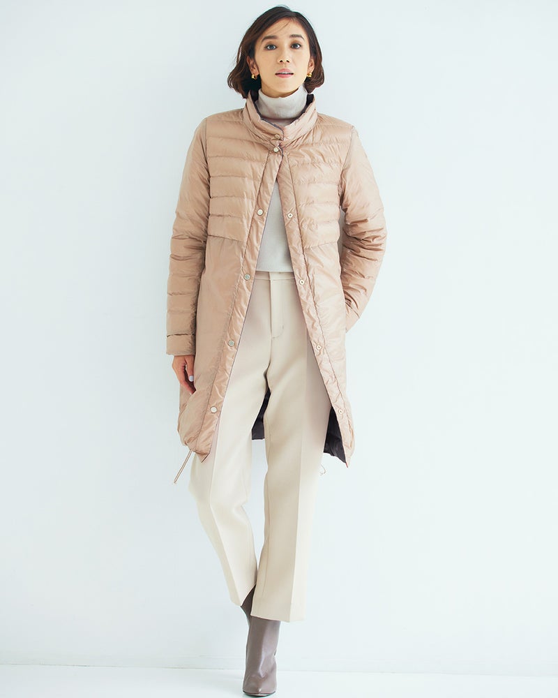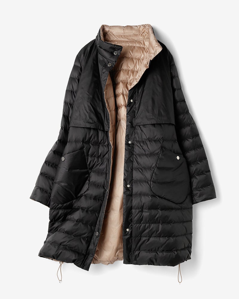 生地にはダウンが透けず強度も軽さも担保できる20デニールのタフタを採用し、片面はシックに、片面は華やかな明るめカラーという配色リバーシブル仕立てに。光を広げる華やかな艶感は、ヨーロッパのデザインダウンに負けない美しさです。