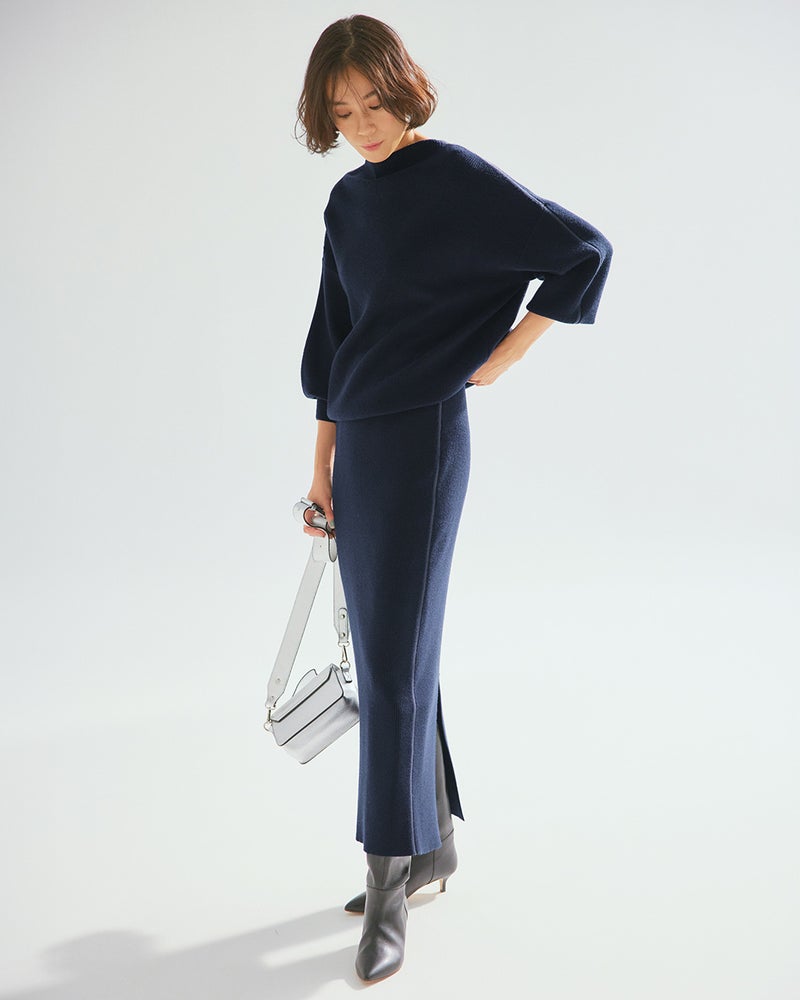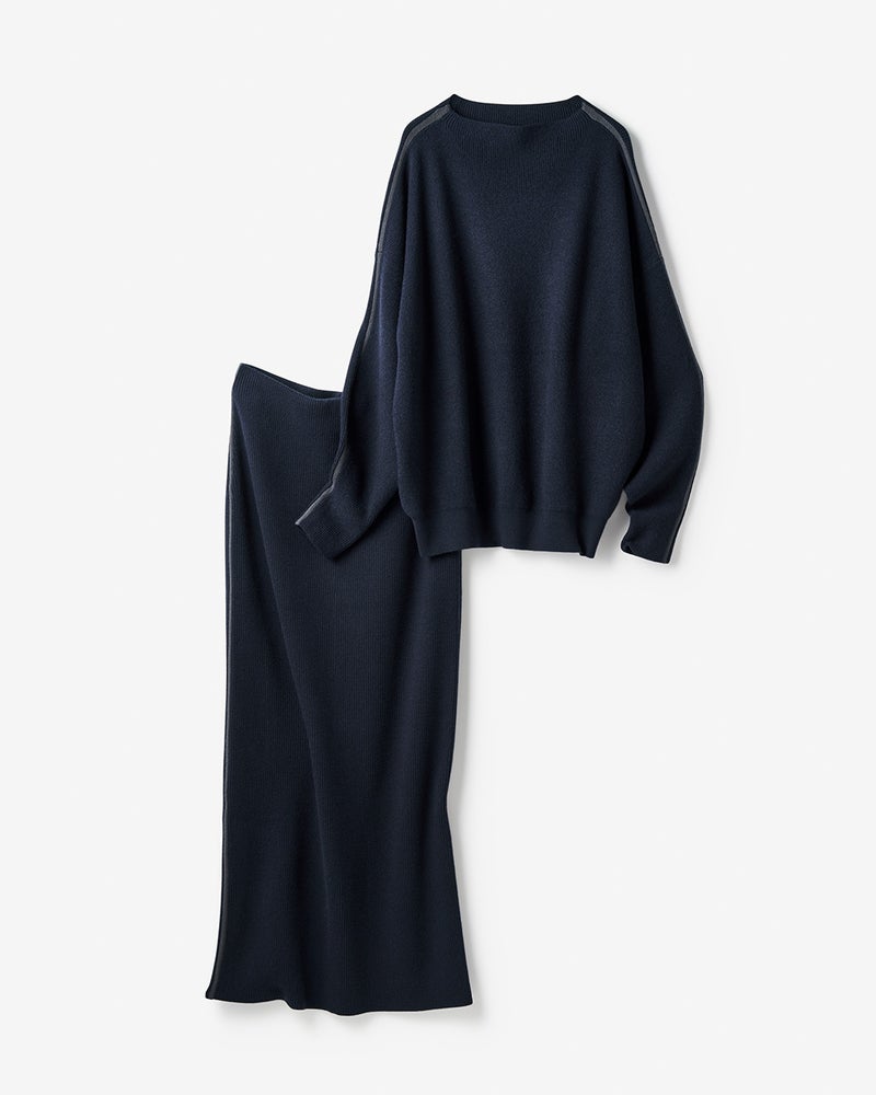 コーディネートに悩まず女らしさもキープできる、ラクちんお洒落なスカートセットのニットアップ。チクつきの原因となるウールをあえてブレンドせず、なめらかな肌ざわりを追求。表情のある片畦編みとサイドラインでメリハリをつけて、洗練された印象に仕上げました。