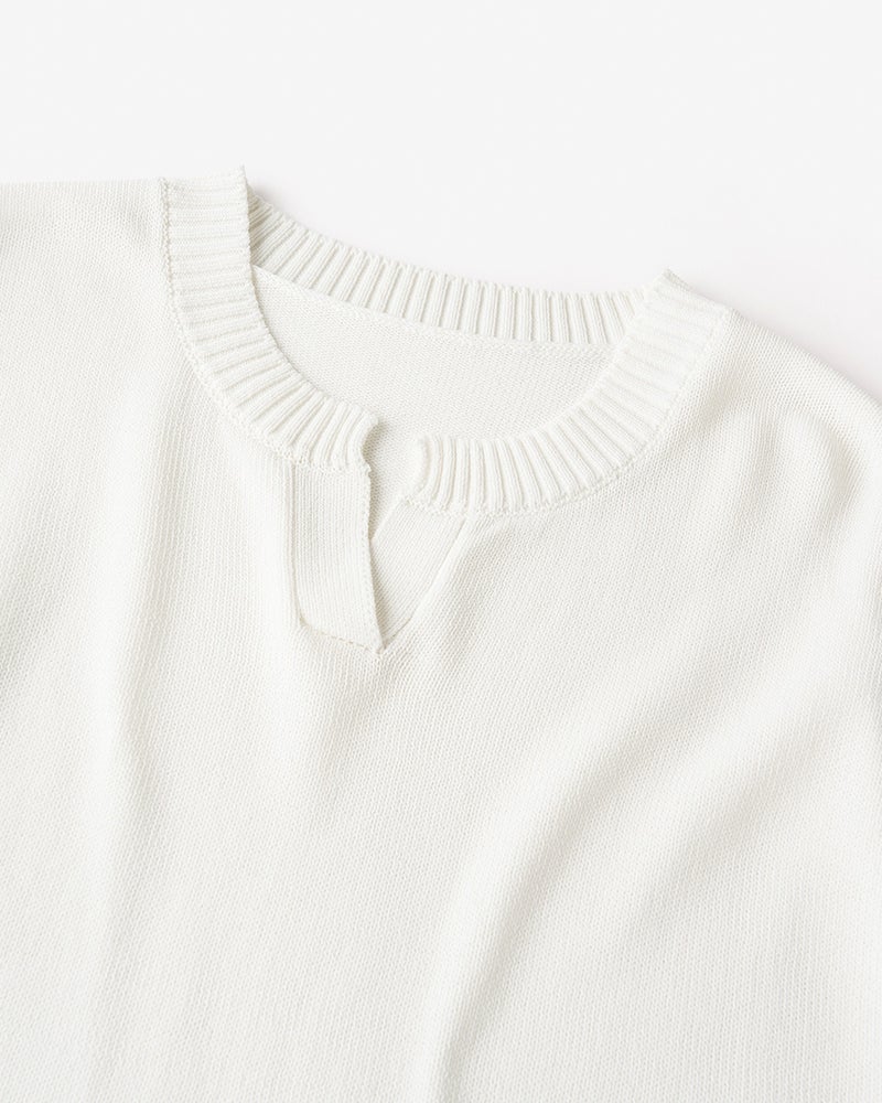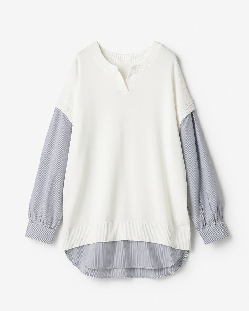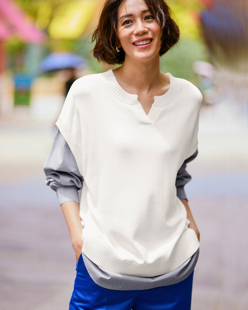 レイヤードのお洒落を楽しみたいけれど、イマイチ決まらない…。そんなお悩みを解決する、ニットベストとシャツ生地のドッキングトップス。あえて衿を付けずキーネックにして、すっきり華奢な印象に仕上げました。