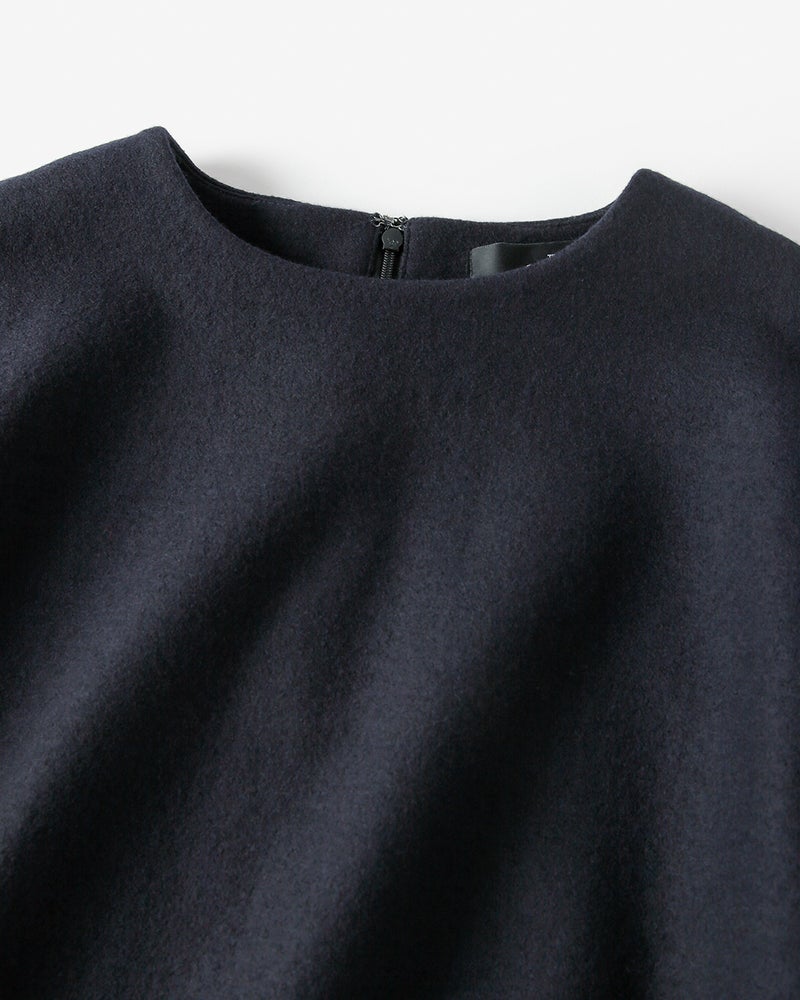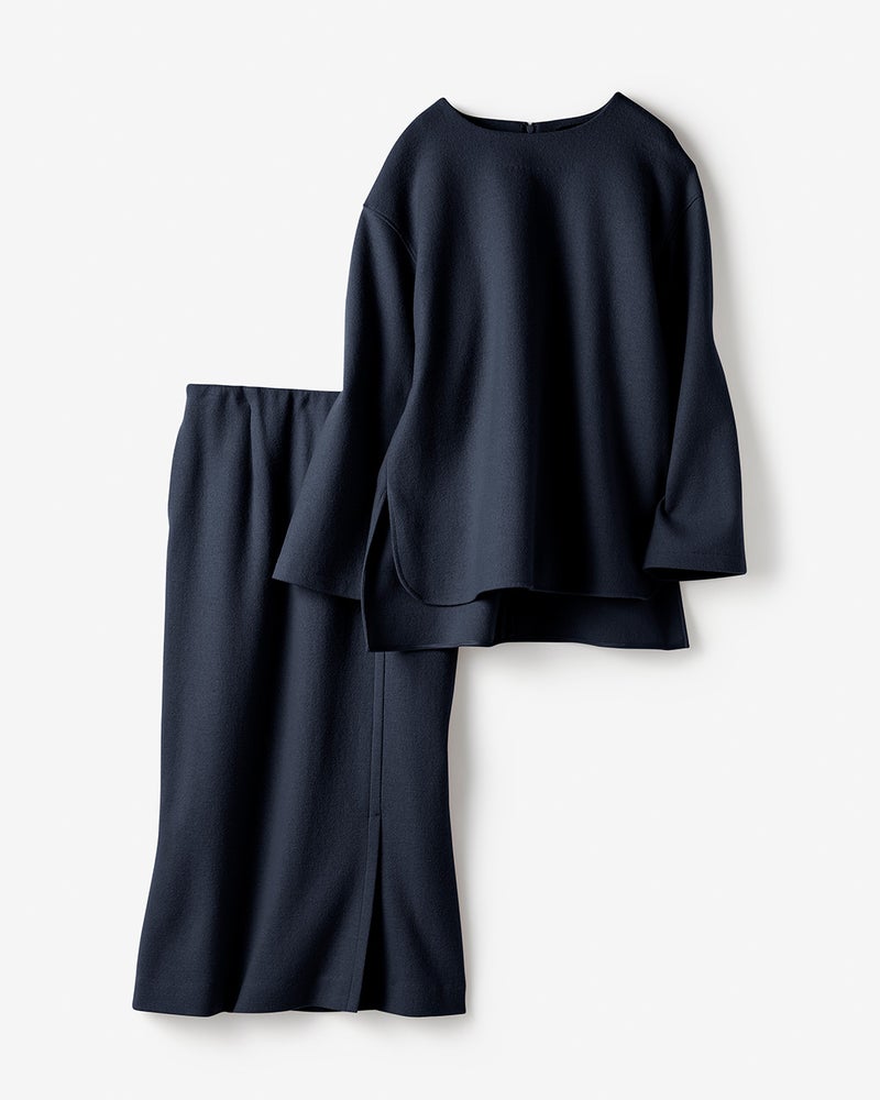 何かと忙しい師走、上下合わせて着るだけでキレイが完成するセットアップが強い味方に。なめらかな表面感を持つ薄手のウールジャージー素材、ほどよくストレッチするから長時間着ていてもストレスフリー。ゆったりクルーネックのトップス×スリットデザインのスカートと上下どちらもシンプルなデザインで、単品での着回しにも大活躍。