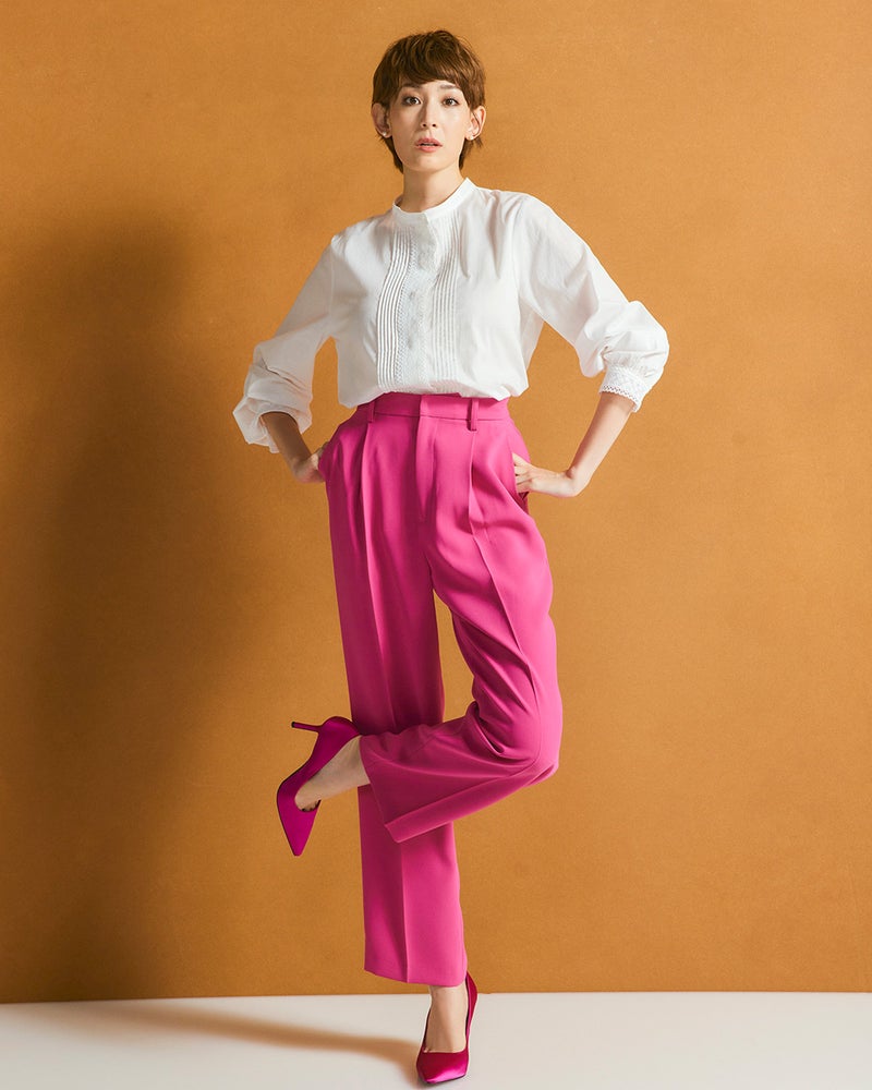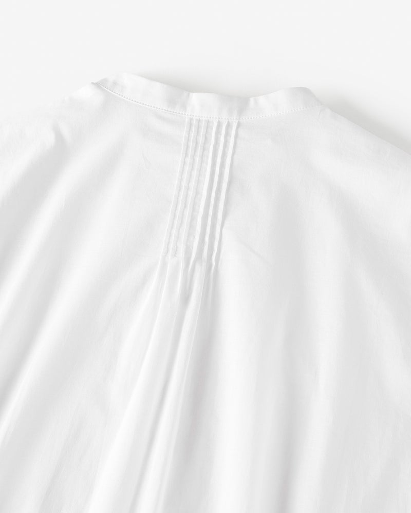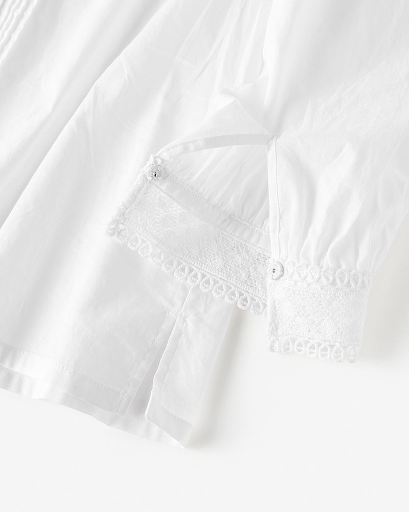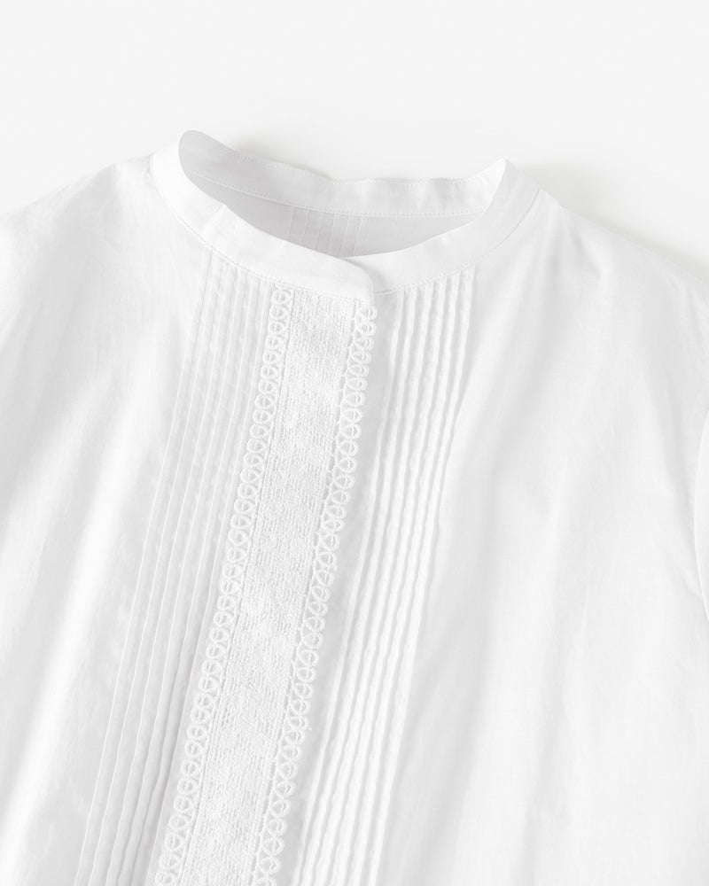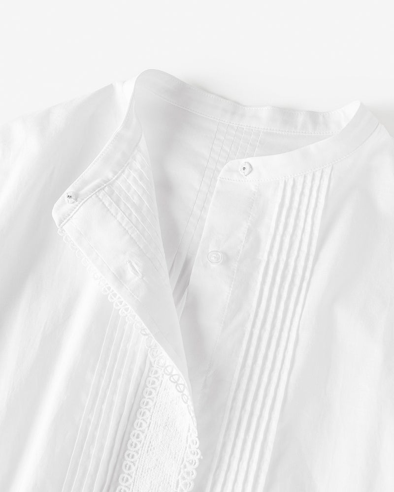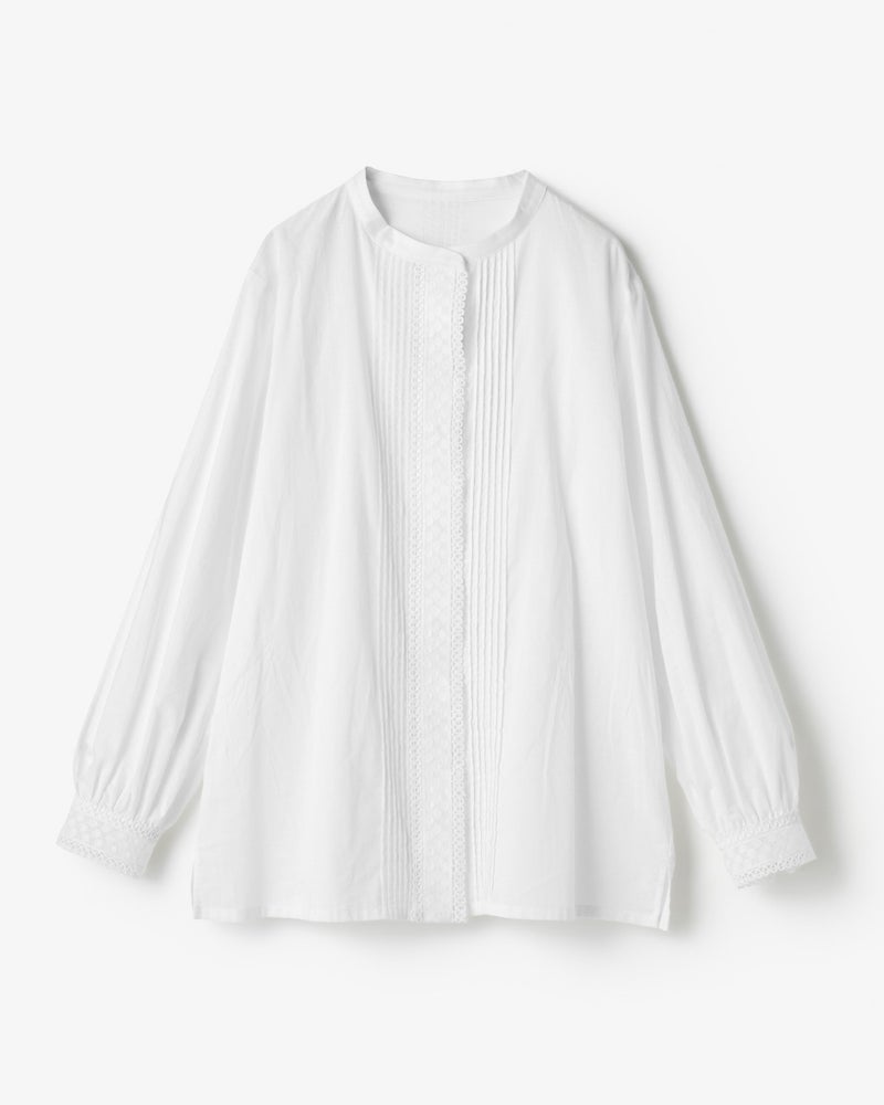 袖口と前立てに繊細なトーションレースをあしらった、艶のあるさらりと軽いコットンローンのブラウス。バンドカラーとフロントのピンタックが甘さを引き締めて、メリハリあるデザインに仕上げています。前開き仕様だから、着脱も楽々。