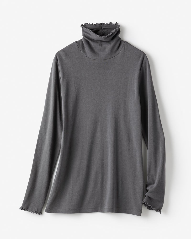 さりげない大人可愛いが完成ネックと袖口をメロウ仕上げにし、花びらのようにキュートに彩ったタートルネックは、フェミニンスタイルがお好きな方におすすめ。