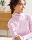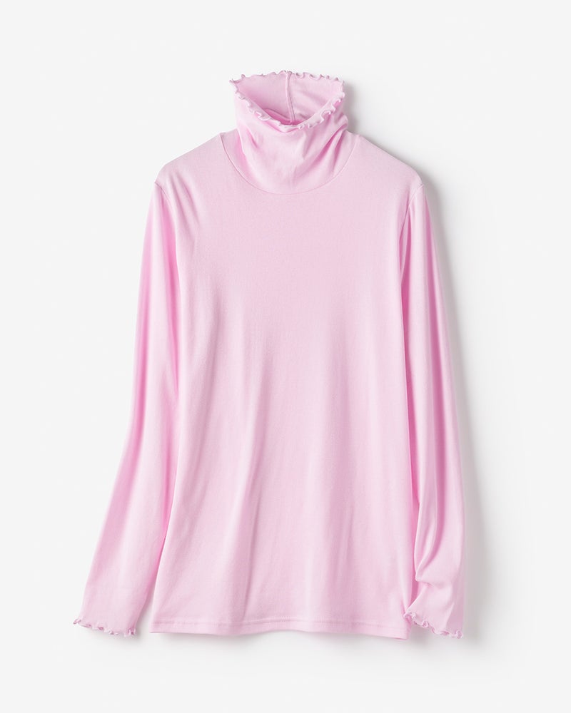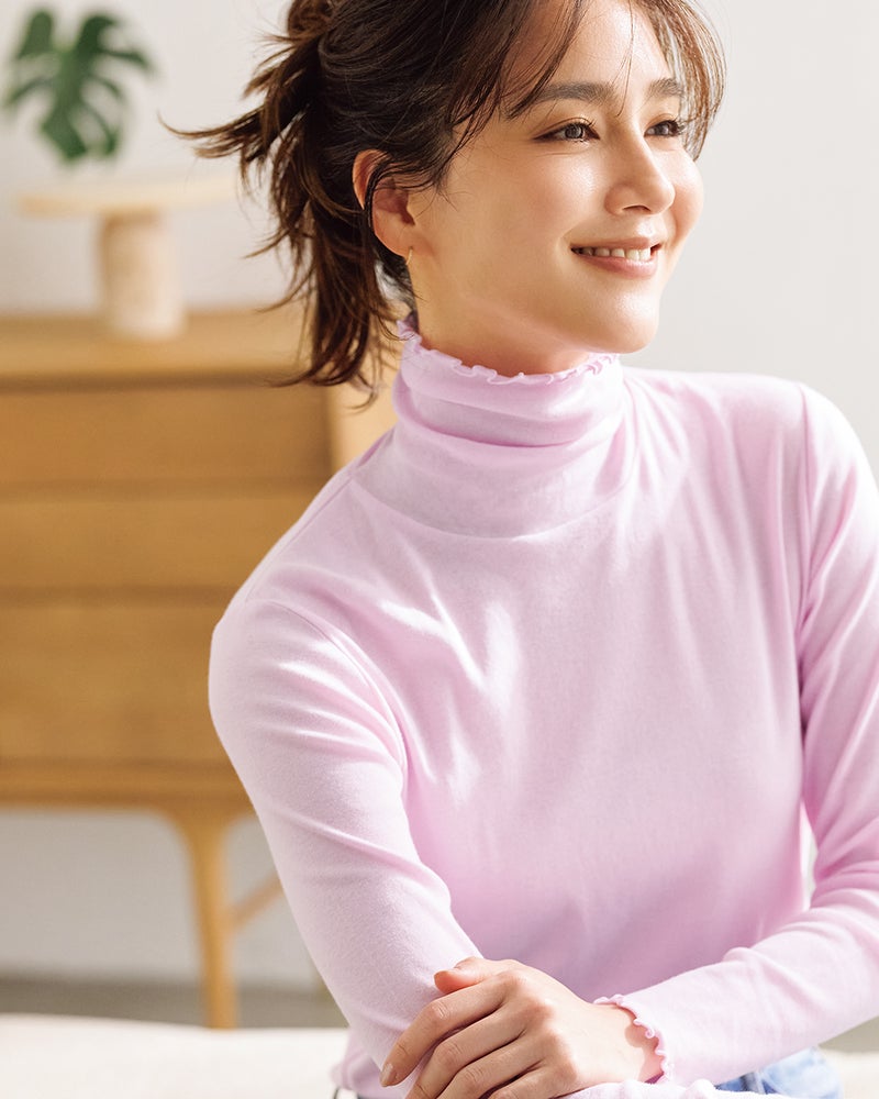 さりげない大人可愛いが完成ネックと袖口をメロウ仕上げにし、花びらのようにキュートに彩ったタートルネックは、フェミニンスタイルがお好きな方におすすめ。
