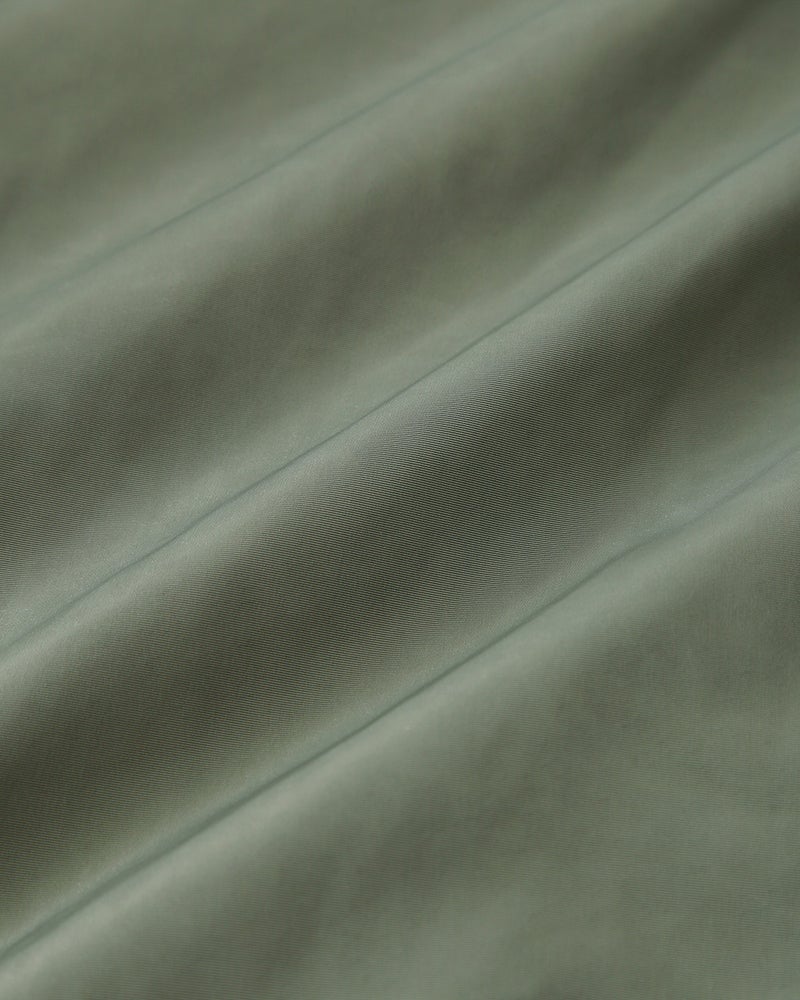 オモテ面は雨や雪をはじく撥水加工済。裏面は光沢感のあるタフタ素材で、よりカジュアルな印象に。