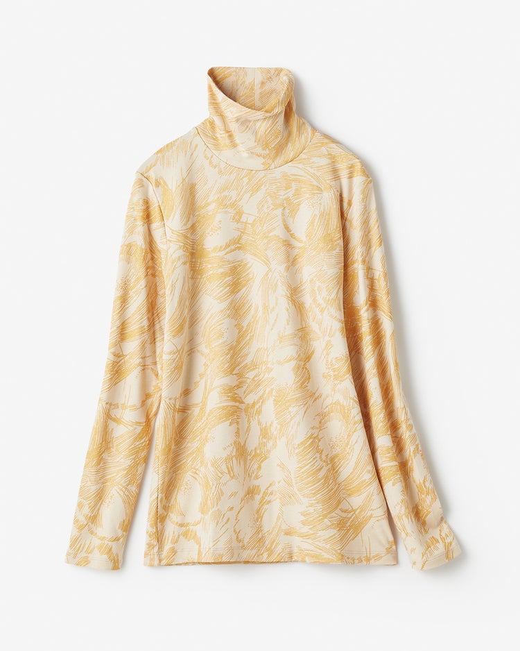 アクリル混ポンチ・メタルボタン プルオーバー(ベージュ)のインナーとして購入しました。ハイネックの襟部分が見えるだけですが、機械的な総柄と色の組み合わせが気に入っています。超長綿なので、お手入れも簡単で重宝しています。