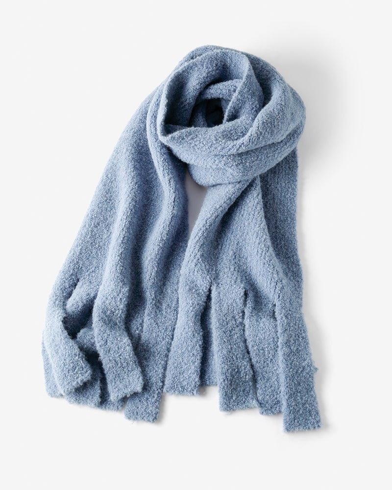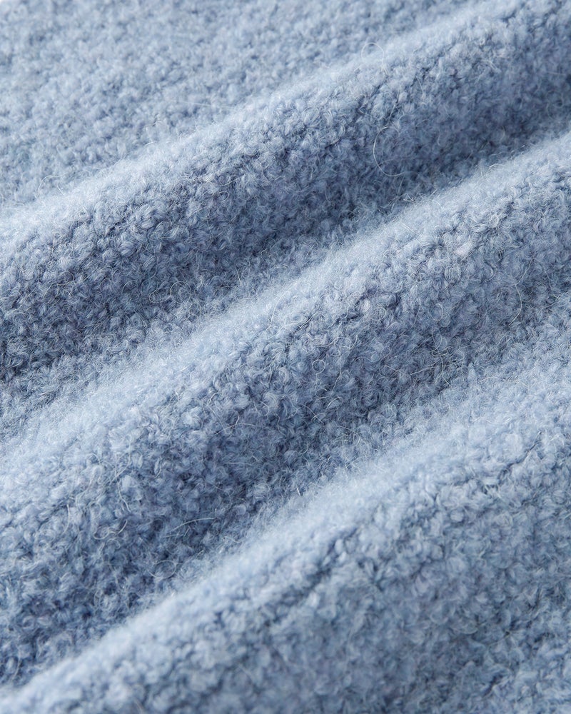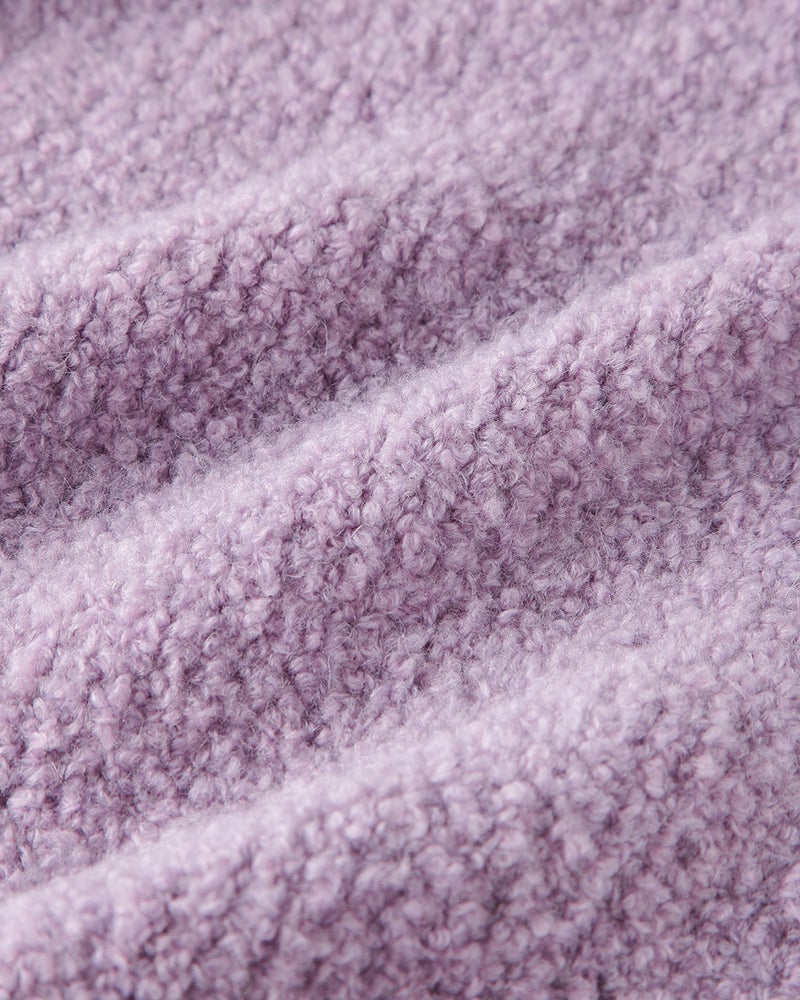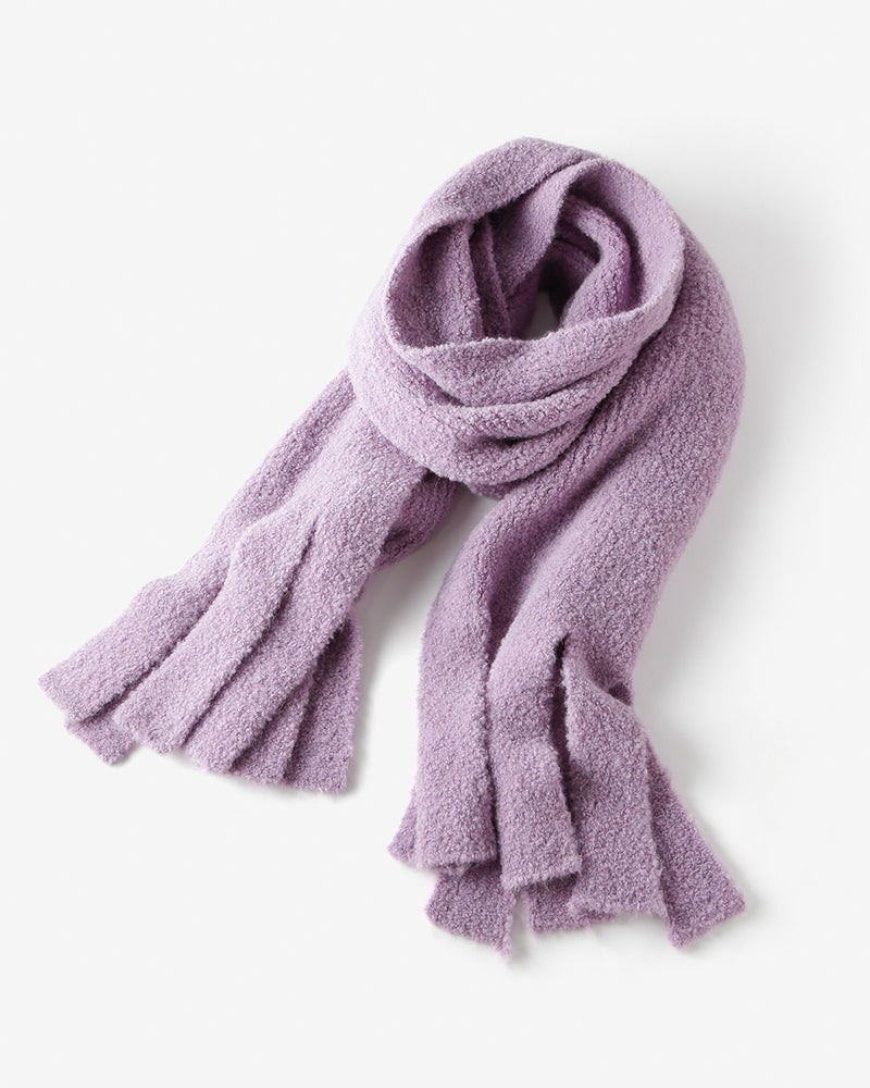 ぽこぽこと立体的な節を持つアルパカループヤーンをざっくりと編み立てて、世にも柔らかなふわふわニットに仕立てのがこちら。ビッグフリンジが今年らしい大判ストールは、さっとラフに巻くだけで着こなしが着映えるあったかアイテム。同素材のセーター(30343)と合わせて、トップス+ストールの新鮮なセットアップもおすすめです。