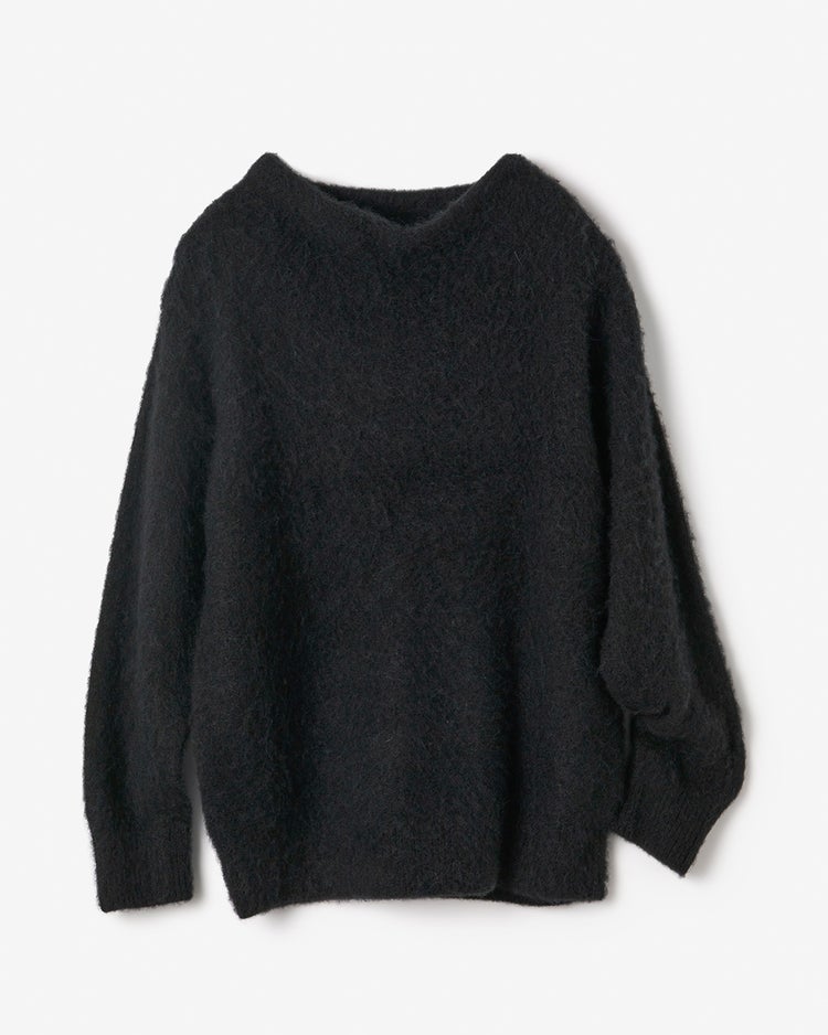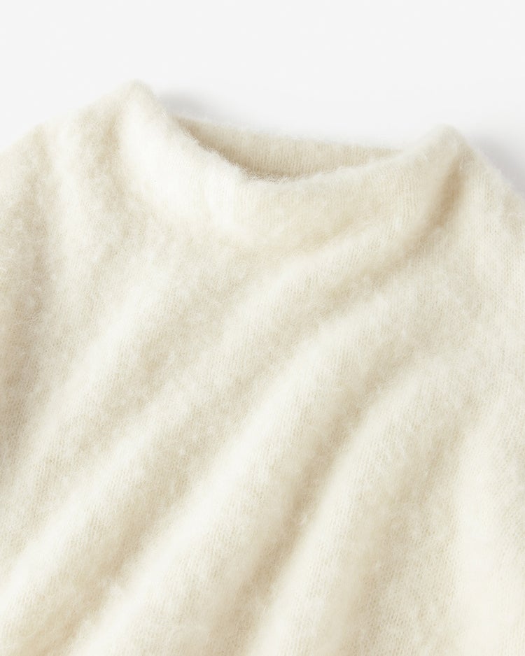 19.5マイクロンという極細毛だけを厳選した最高級ロイヤルアルパカを、女らしさ際立つシャギー仕立てのふわふわニットに仕上げました。ゆったりした身頃、首もとを綺麗に魅せるファネルネックで、こなれた女らしさを実現。