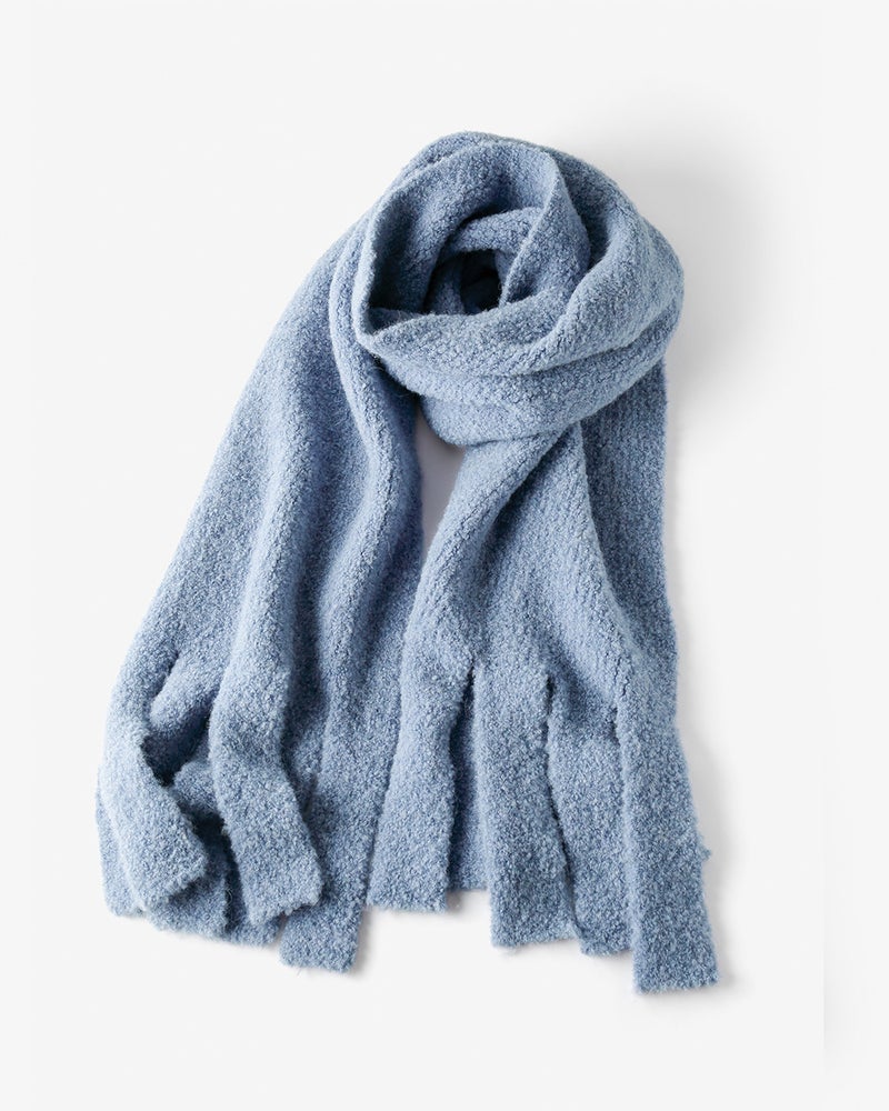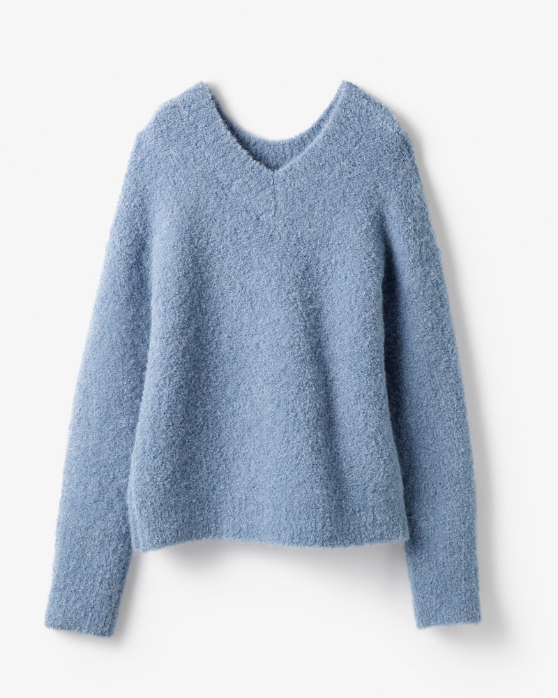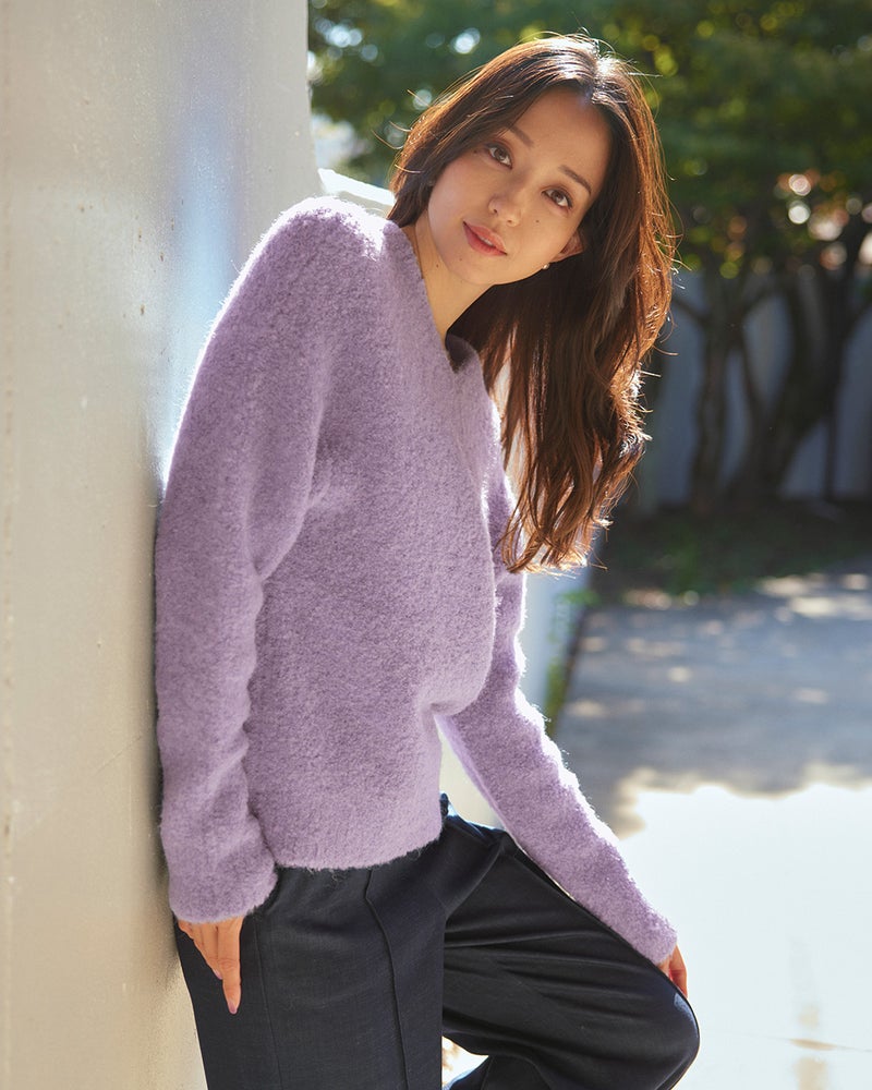 ぽこぽこと立体的な節を持つアルパカループヤーンをざっくりと編み立てて、世にも柔らかなふわふわニットに仕立てたのがこちら。立体的なニットの質感を活かしたシンプルなニットセーターは、実は前後どちらも着られる2WAY仕様。クルーネックで可愛く、Vネックで女らしく着こなせます。また、ビッグフリンジが今年らしい大判ストールは、さっとラフに巻くだけで着こなしが着映えるあったかアイテムです。