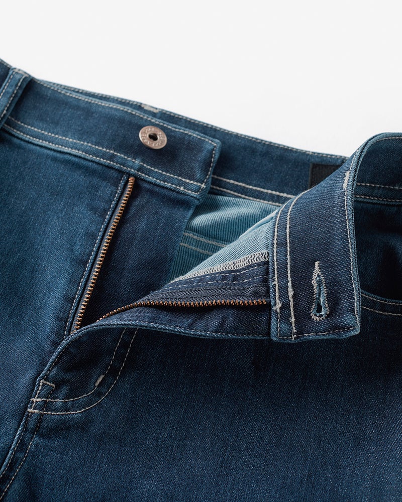 一般的なデニムは10オンス程度の生地の厚みのところ、糸の打ち込みを弱くすることで7.5オンスという軽い風合いを実現。さらにポリウレタンのストレッチ性もプラスすることで、驚くほどリラックスできるはき心地に仕上げています。