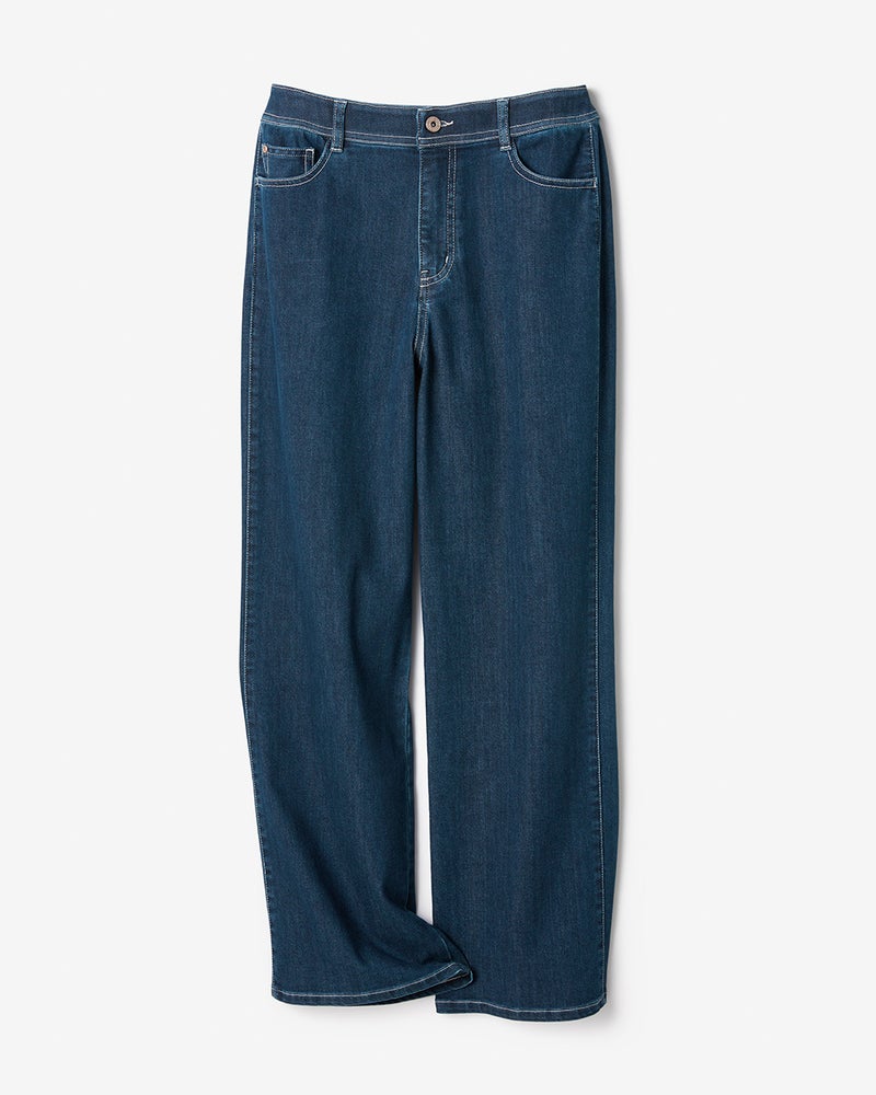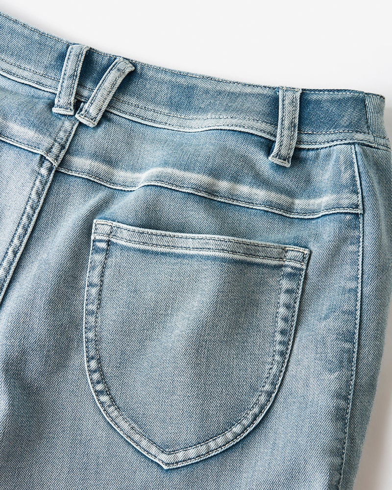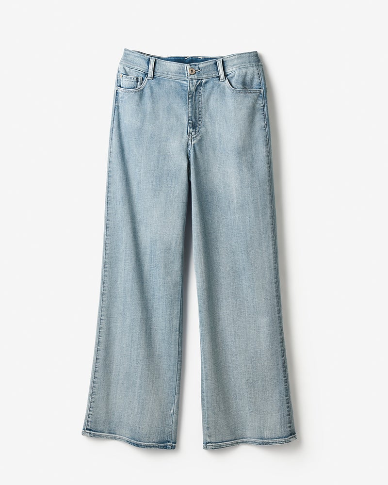 一般的なデニムは10オンス程度の生地の厚みのところ、糸の打ち込みを弱くすることで7.5オンスという軽い風合いを実現。さらにポリウレタンのストレッチ性もプラスすることで、驚くほどリラックスできるはき心地に仕上げています。 縦に落ちる柔らかな素材や、立体裁断が引き締まったヒップライン&細見えを演出。ウエストの芯地にもストレッチを効かせ、たくさん食べても安心の着心地を実現しました。