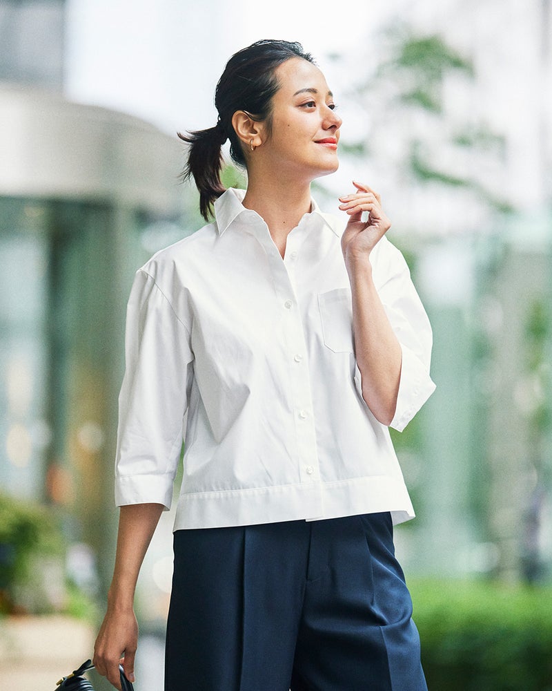 - 年齢を重ねると、白の羽織に黒のワンピースの組み合わせが楽です。このシャツブルゾンはそんな着こなしにピッタリ。数が増えた黒をはじめ各色のワンピースのはおりに合わせて活用しています。